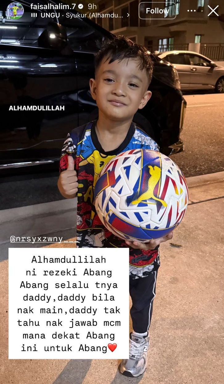 Menerusi laman Instagram, dia berkongsikan: "Alhamdulilah ni rezeki abang, abang selalu tanya daddy, daddy bila nak main, daddy tak tahu nak jawab macam mana dekat abang. Ini untuk abang." katanya.