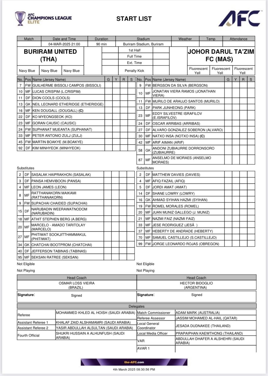 Ketua jurulatih Harimau Selatan, Hector Bidoglio, meletakkan Jese Rodriguez, Juan Muniz, Heberty, Obregon termasuk pemain baru, Samuel Castillejo, di bangku simpanan dalam kunjungan pertama pusingan 16 ACLE di Bangkok.