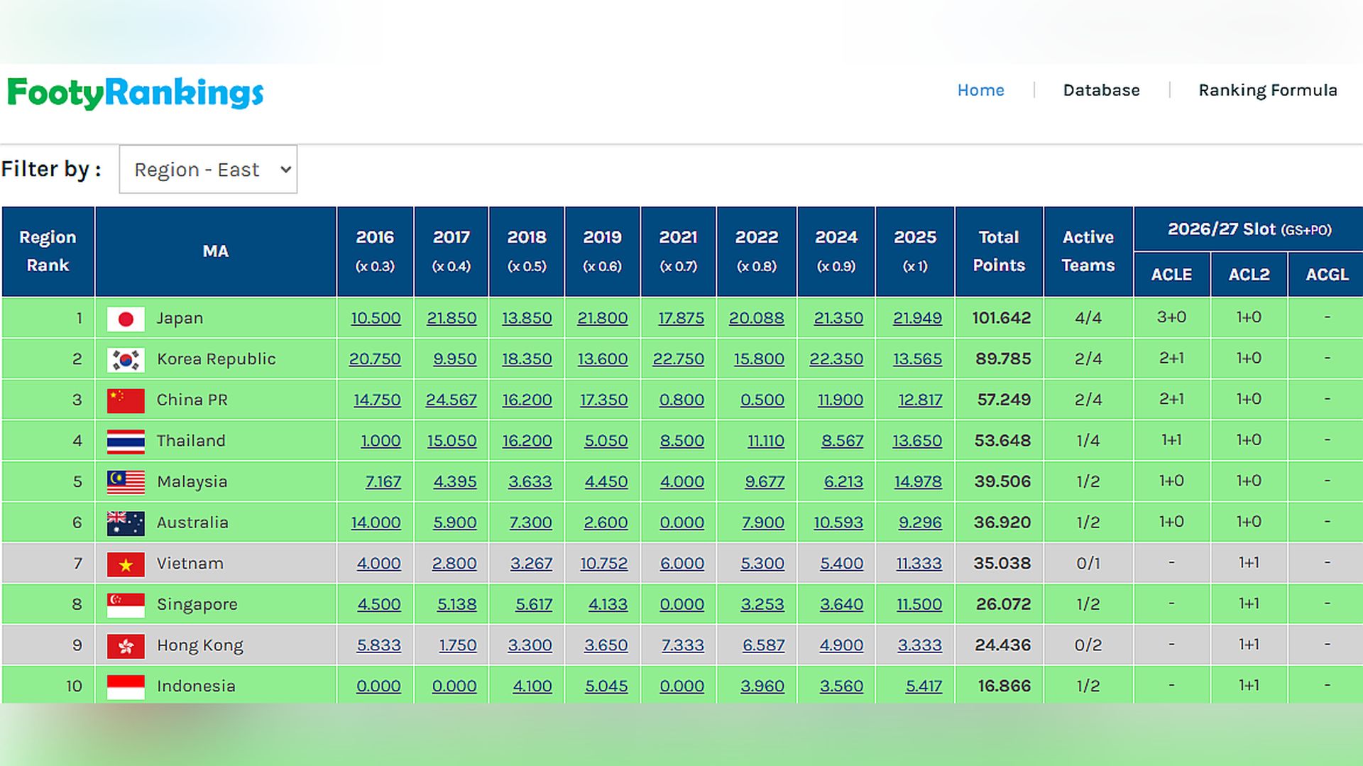 Kemas kini AFC Rankings untuk Asia Timur, Malaysia mendaki satu anak sekaligus mengesahkan slot ke Liga Juara-Juara Asia Elit (ACLE) bagi musim 2025/2026.