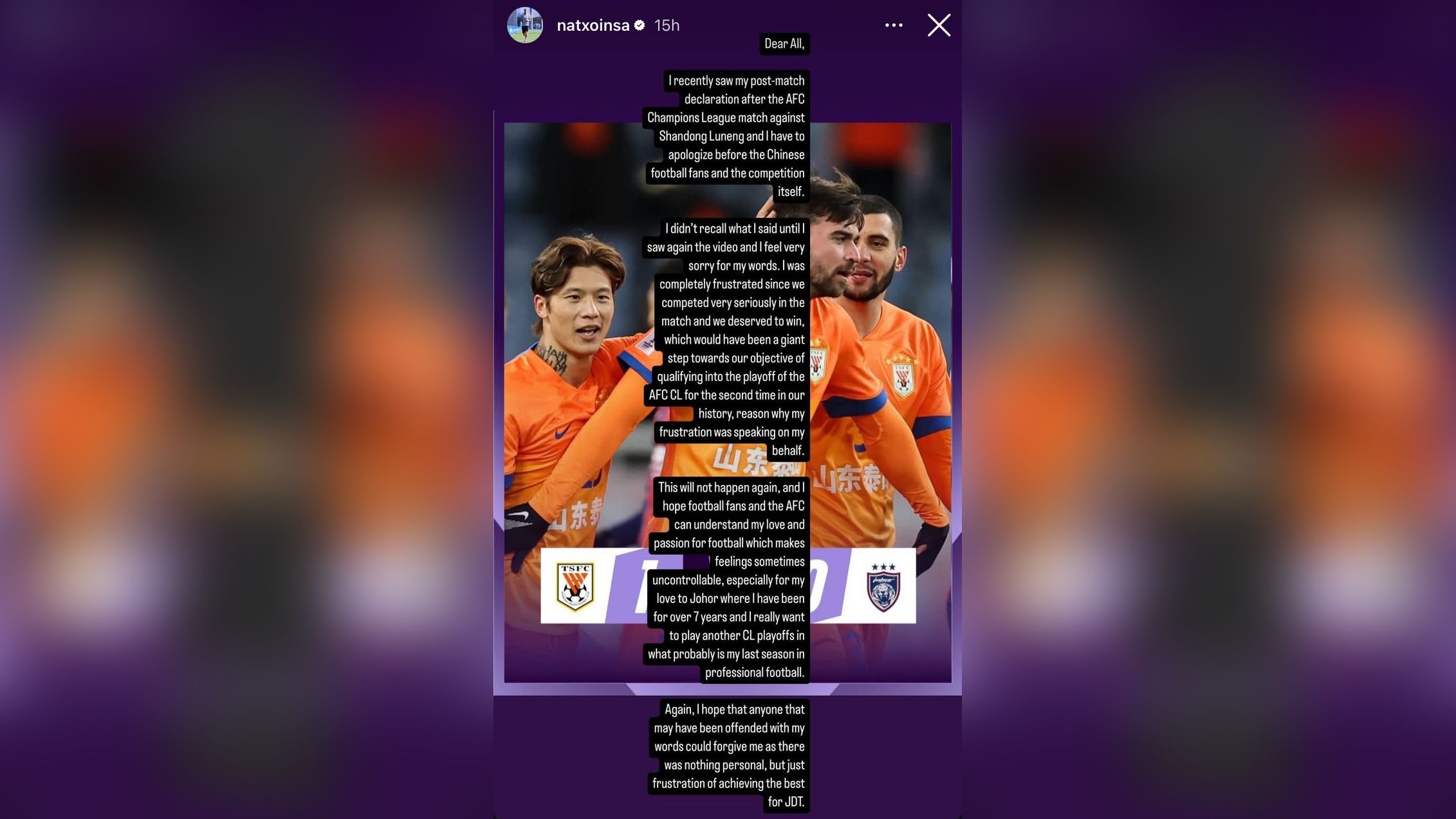 Ketua pasukan Johor Darul Ta'zim (JDT), Natxo Insa, memohon maaf kepada peminat Shandong Luneng dan kejohanan Liga Juara-Juara Asia Elit (ACLE) mengenai kata-katanya yang menyinggung selepas perlawanan itu, bulan lalu.