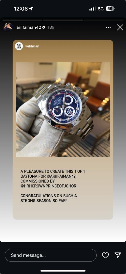 Jam berjenama Rolex model Daytona itu yang dibuat khas itu tertera nombor jersi 42 yang menjadi pilihan Arif Aiman.