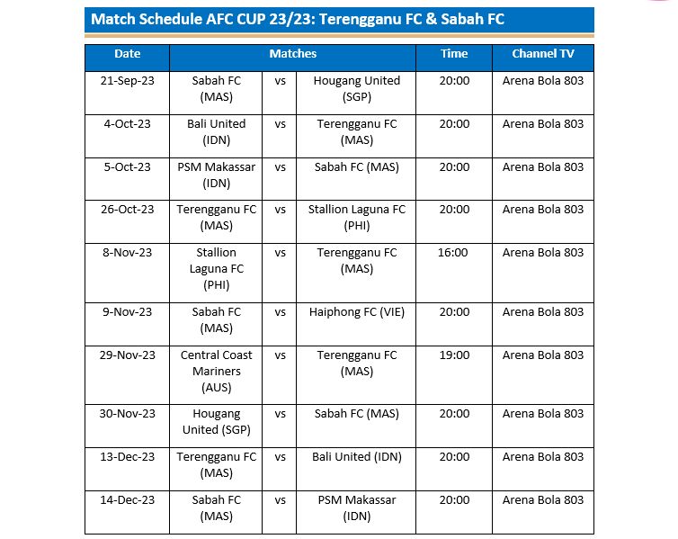 Perlawanan siaran langsung itu juga akan membabitkan wakil daripada Liga Malaysia dalam kejohanan anjuran Konfederasi Bolasepak Asia (AFC), iaitu Johor Darul Ta'zim (JDT), yang beraksi dalam saingan ACL manakala Sabah FC dan Terengganu FC pula berentap dalam Piala AFC.