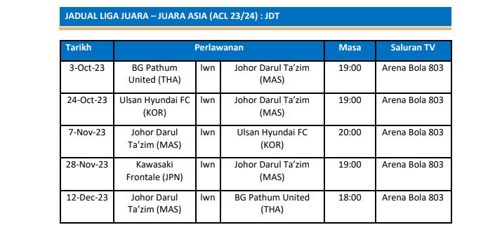 Astro akan membawakan aksi Liga Juara-Juara Asia (ACL) dan Piala AFC, yang telah pun bermula dari 18 September 2023 hingga 25 Mei 2024, buat peminat bola sepak negara dan juga pelangan pek sukan Astro.