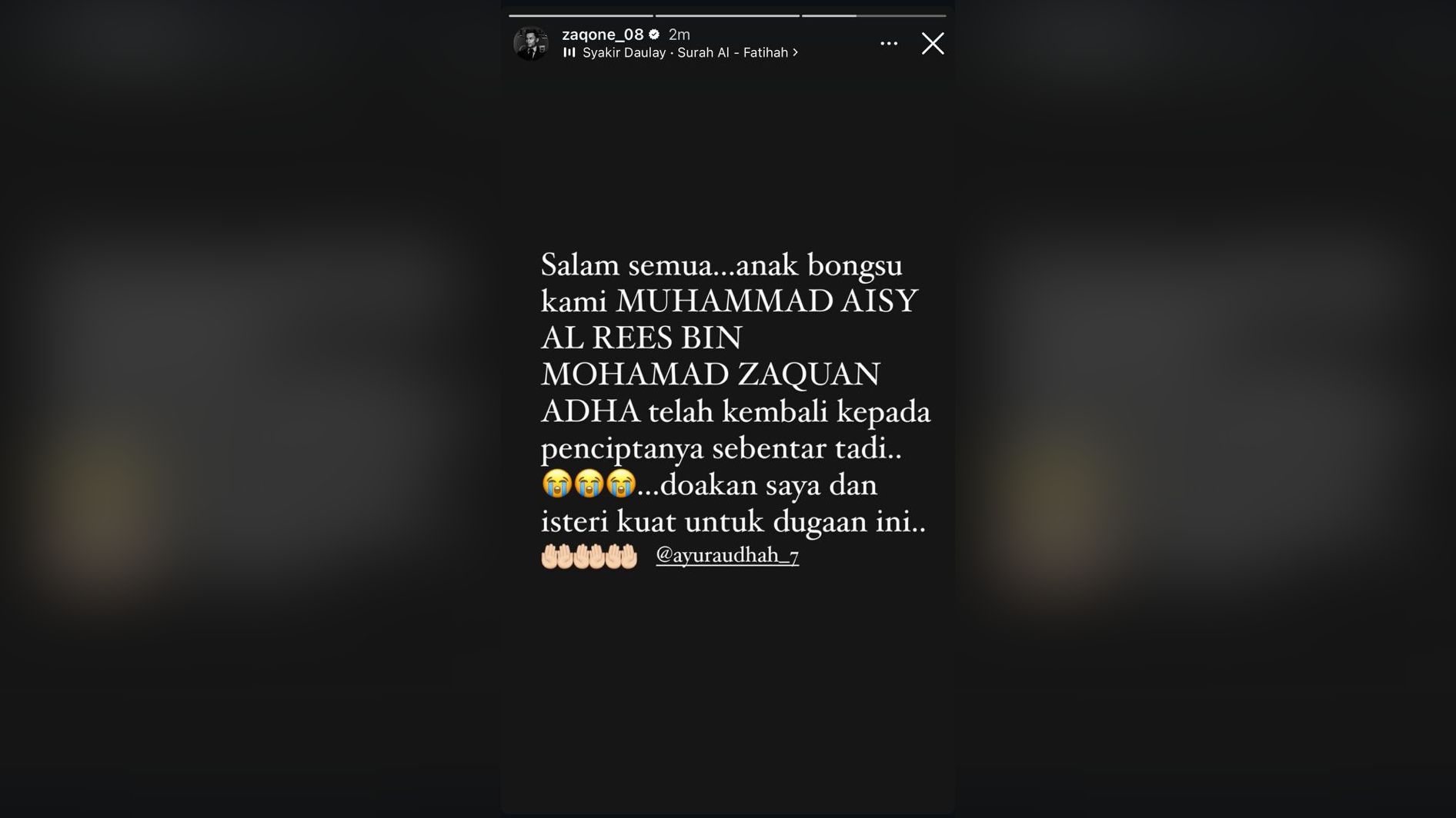 Bekas pemain kebangsaan, Zaquan Adha Abddul Radzak, kehilangan anak bongsunya, Muhammad Aisy Al Rees, hari ini dan perkara itu disahkan oleh bekas pemain kebangsaan itu sendiri menerusi perkongsian di laman Story Instagram miliknya.