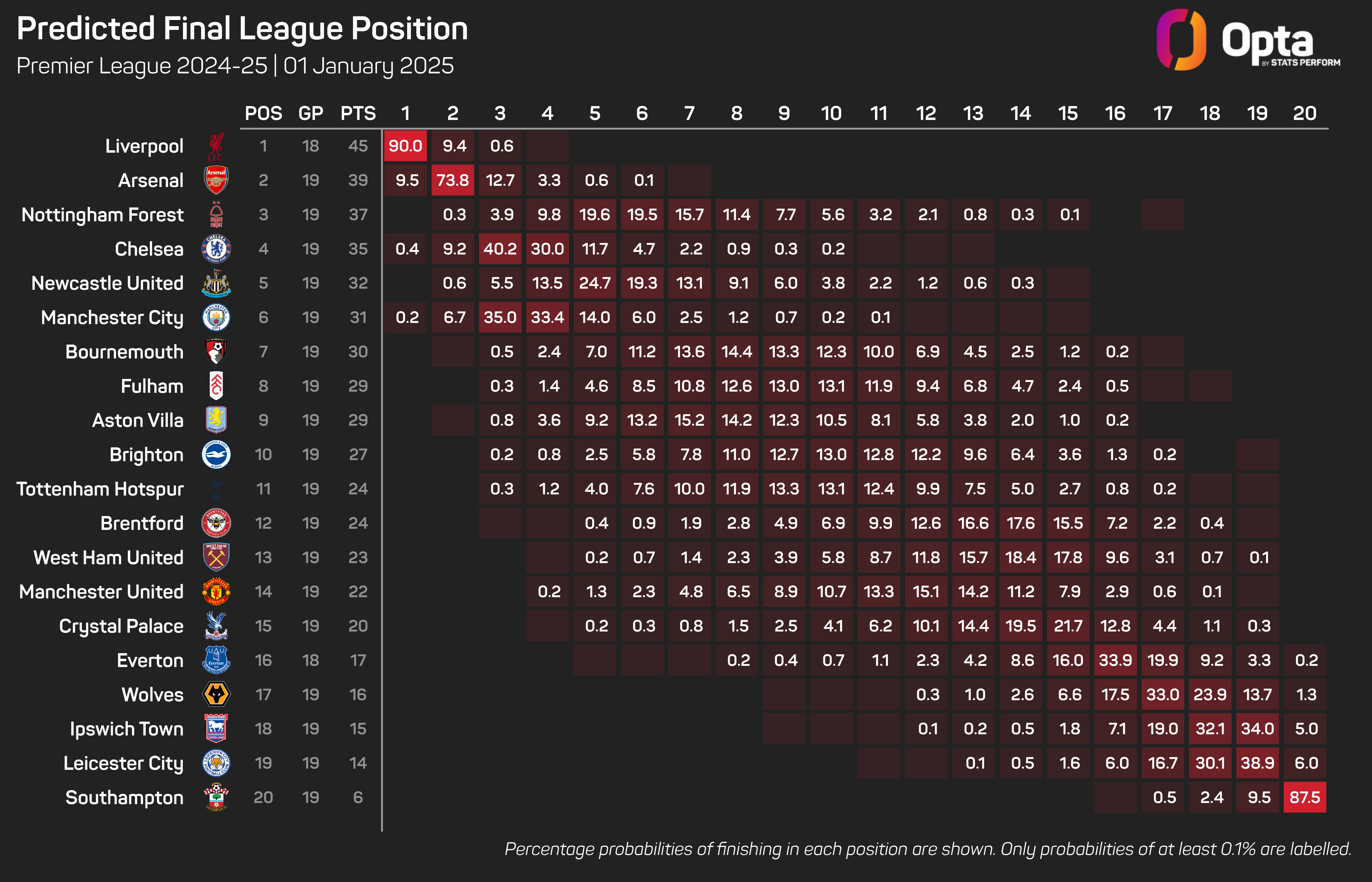 Menurut analisis Opta, Arsenal hanya mempunyai peluang sebanyak 9.5% untuk memenangi gelaran Liga Perdana pertama mereka sejak musim 2003-2004 dengan Arteta seolah-olah bersetuju dengan ramalan itu.