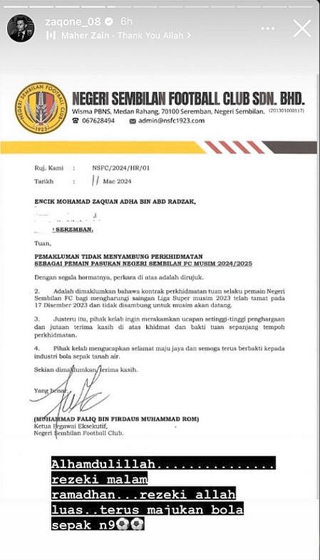 Dalam satu temu bual penuh beremosi bersama wartawan Astro Arena Zulhelmi Zainal Azam, Zaquan Adha, dengan penuh kehibaan, berkata: "Inilah lumrah sebagai pemain bola sepak. Pasukan Negeri Sembilan sebenarnya sudah berlatih hampir seminggu tetapi saya tidak dapat apa-apa makluman daripada pihak pengurusan sebelum ini.