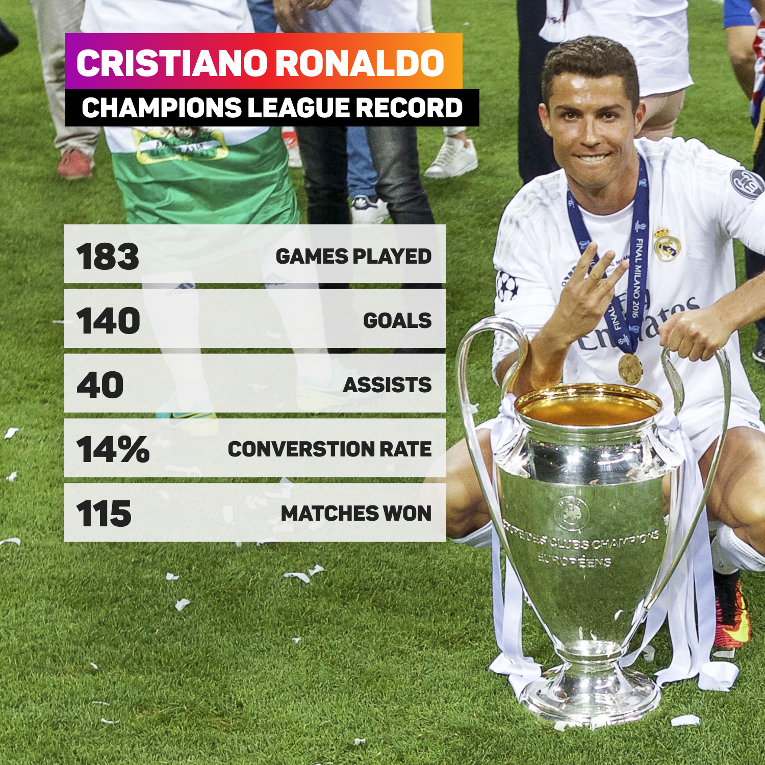 Ronaldo merupakan penjaring terbanyak UCL dengan 140 gol dan telah memenangi pertandingan itu bersama United sekali dan empat kali untuk Real Madrid.