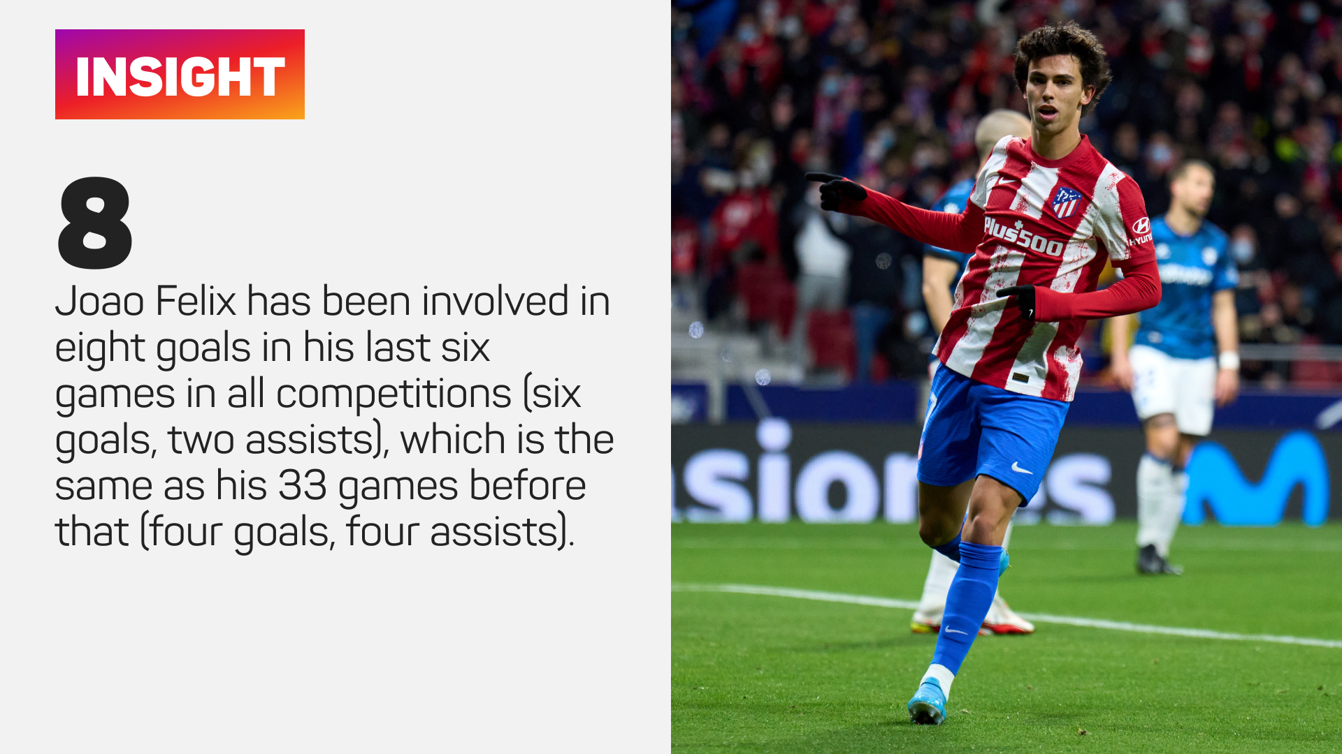 Joao Felix terlibat dengan lapan gol dalam enam perlawanan terakhir (enam gol, dua bantuan jaringan), untuk menyamai pencapaian sebanyak 33 perlawanan sebelum ini (empat gol, empat bantuan jaringan).