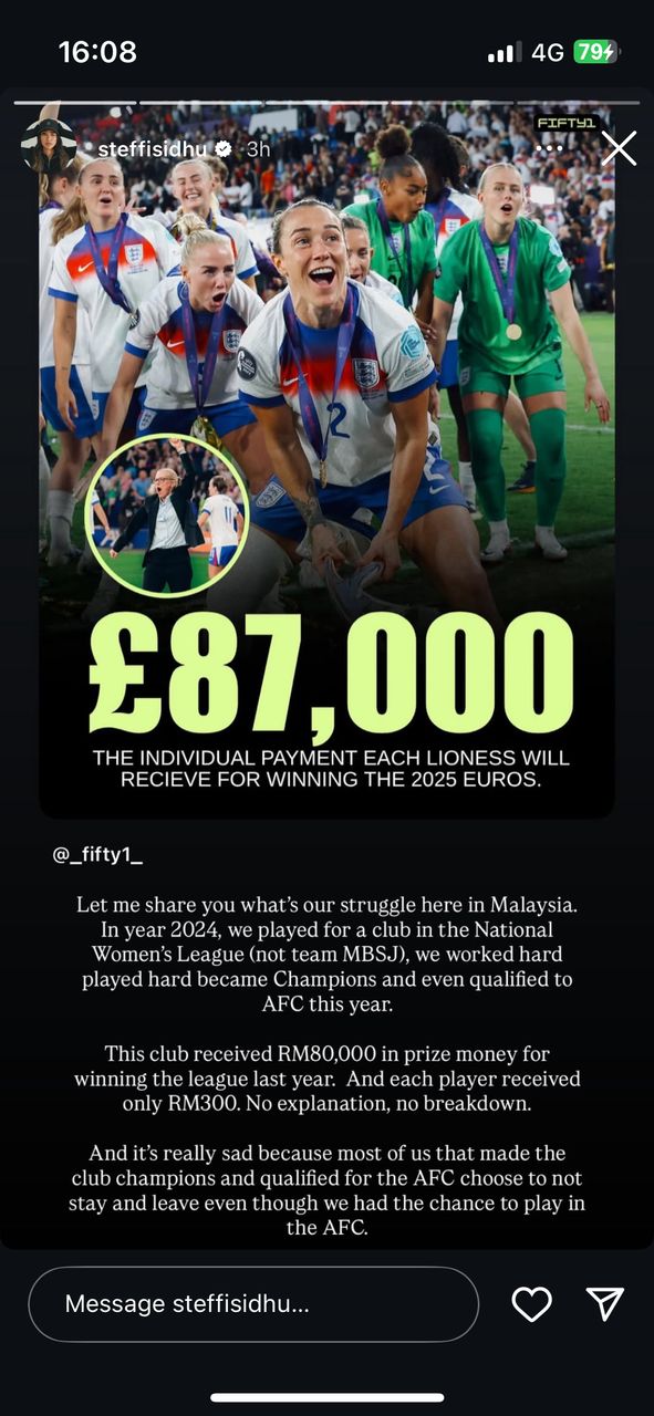 Dia menulis, "Biar saya kongsikan kesukaran dialami kami di Malaysia. Pada tahun 2024, kami bermain untuk kelab Liga Wanita Kebangsaan (bukan pasukan MBSJ), kami bekerja keras, bermain bersungguh-sungguh menjadi Juara malah layak ke AFC tahun ini.