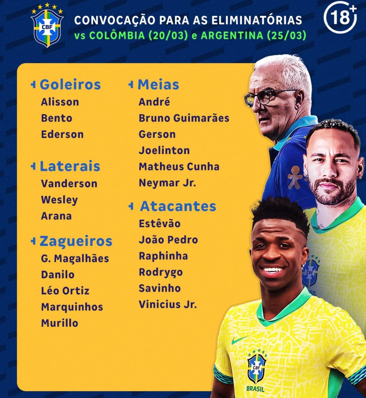 Bintang muda Real Madrid; Endrick, Ederson (Manchester City), Joao Gomes (Wolverampton) turut tidak mendapat tempat untuk membarisi skuad Selecao yang memburu slot ke Piala Dunia 2026 di Kanada, Amerika Syarikat dan Mexico.
