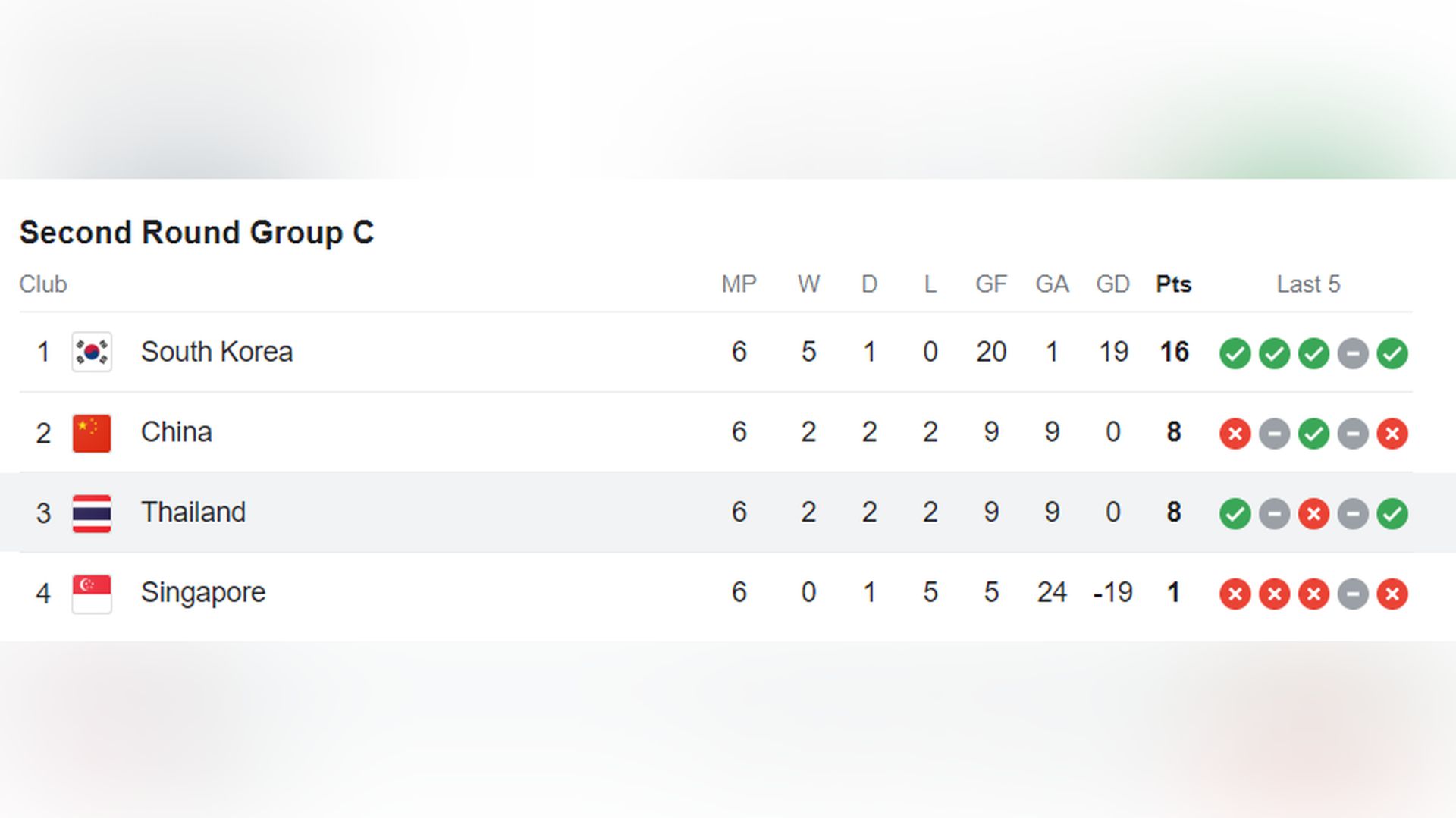 Dengan kemenangan itu, Thailand mendapat pungutan mata yang sama dengan China, yang layak ke ke pusingan ketiga dan secara merit bakal beraksi di Piala Asia.