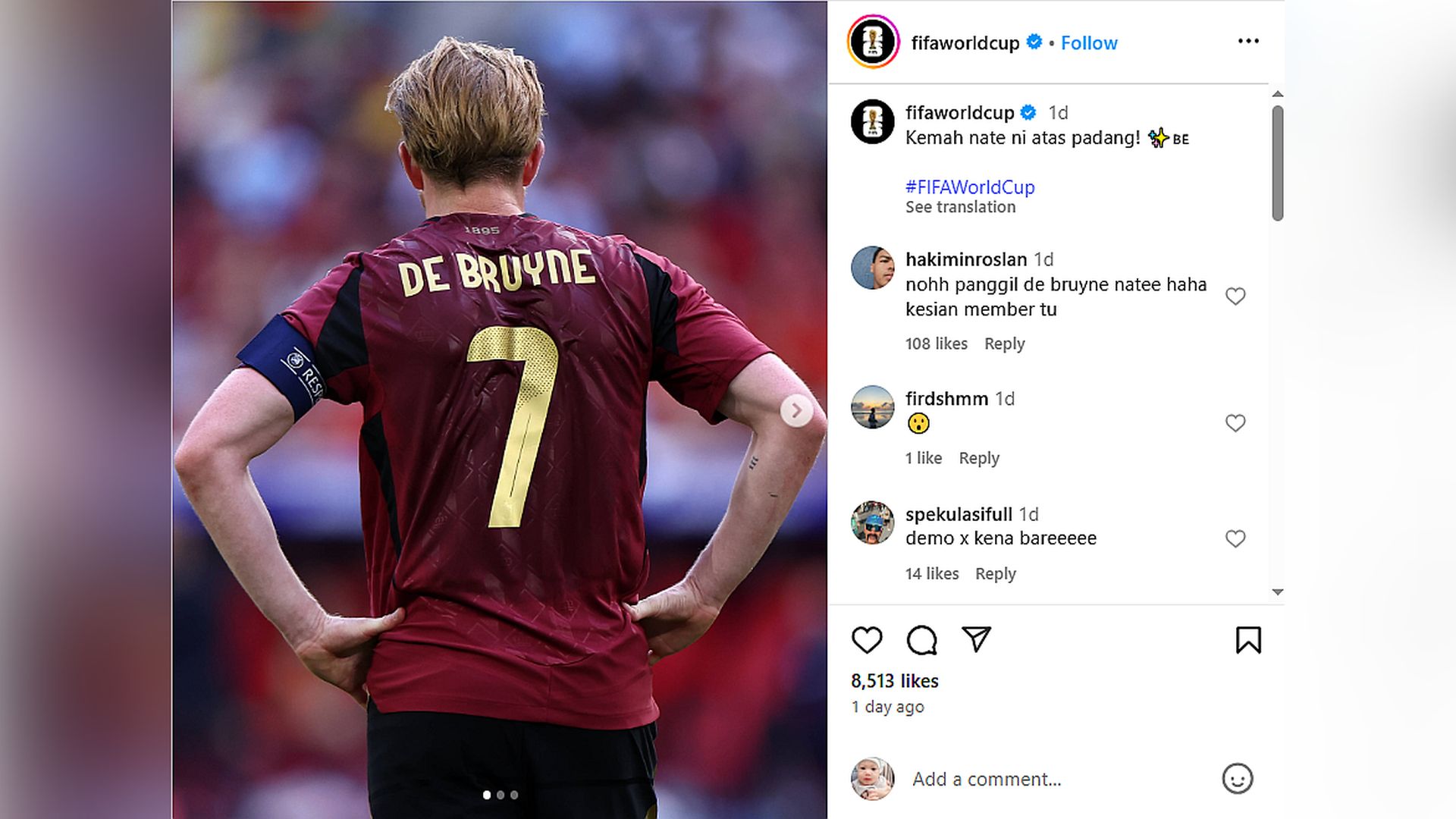 Dan demi memberikan penghargaan buat De Bruyne, laman Instagram, fifaworldcup memuat naik gambar bintang tengah itu dengan kapsyen, "Kemah nate ni atas padang!"