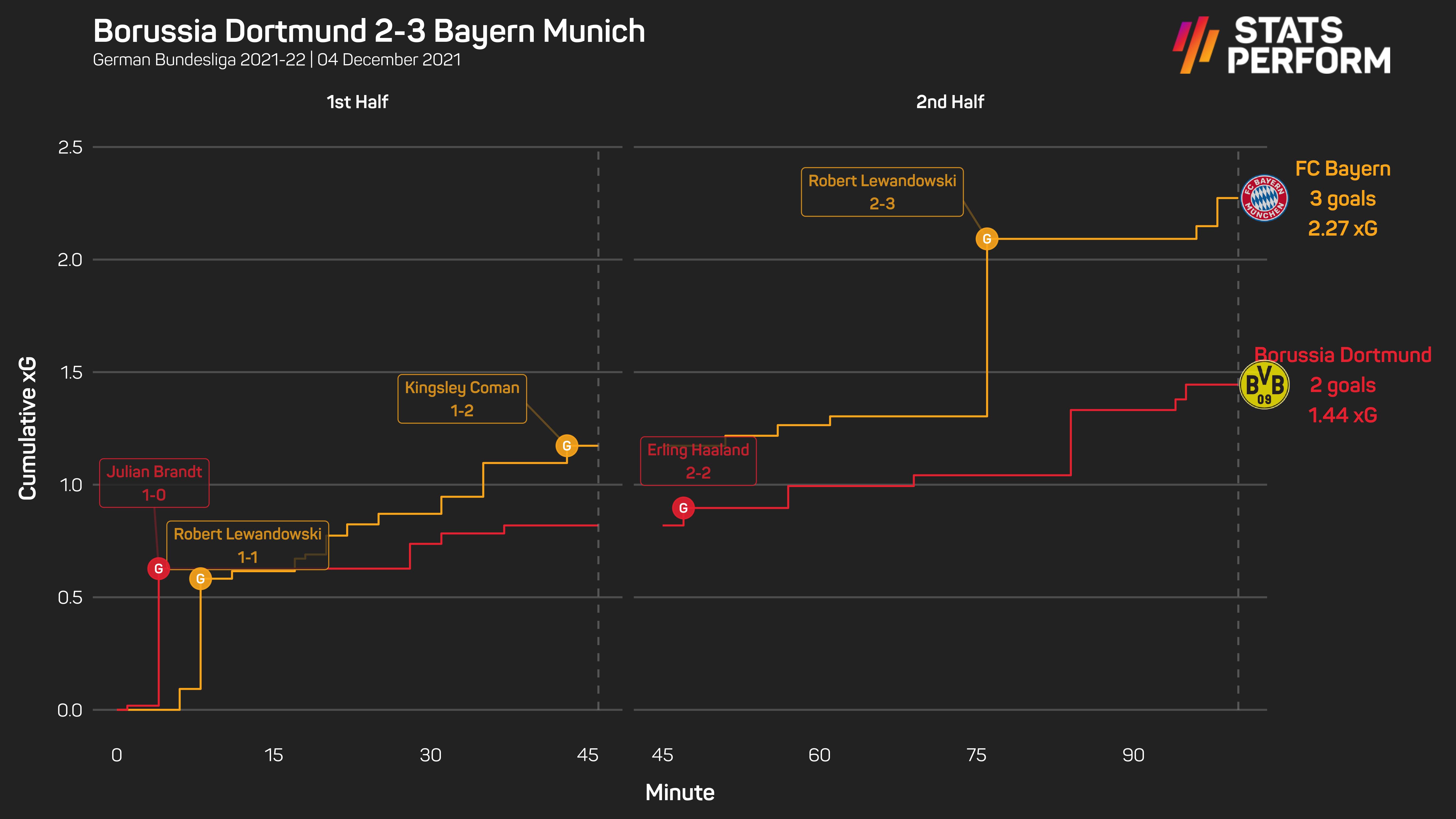 Yang pertama, bantahan Marco Reus tidak diendahkan apabila pemain Dortmund itu disandung Lucas Hernandez di dalam kotak penaltil Bayern sebelum pelawat memastikan kemenangan mereka dengan cara yang sama.