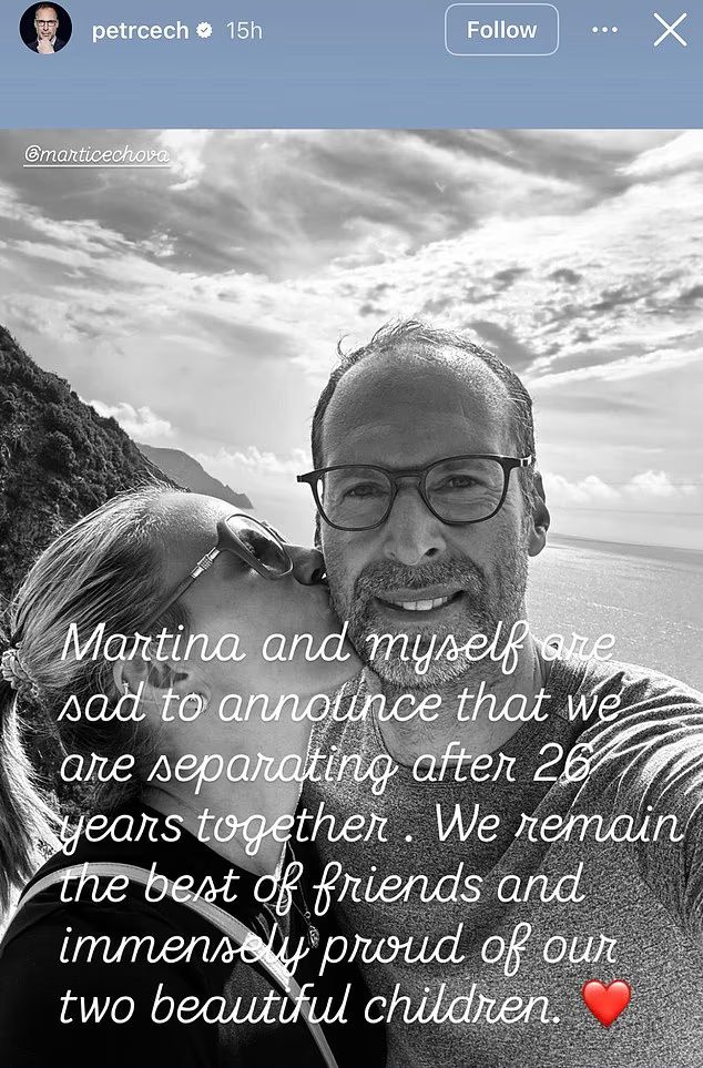 Bekas penjaga gol Chelsea dan Arsenal, Petr Cech, telah mengumumkan bahawa dia dan isterinya telah berpisah selepas 26 tahun berkahwin.
