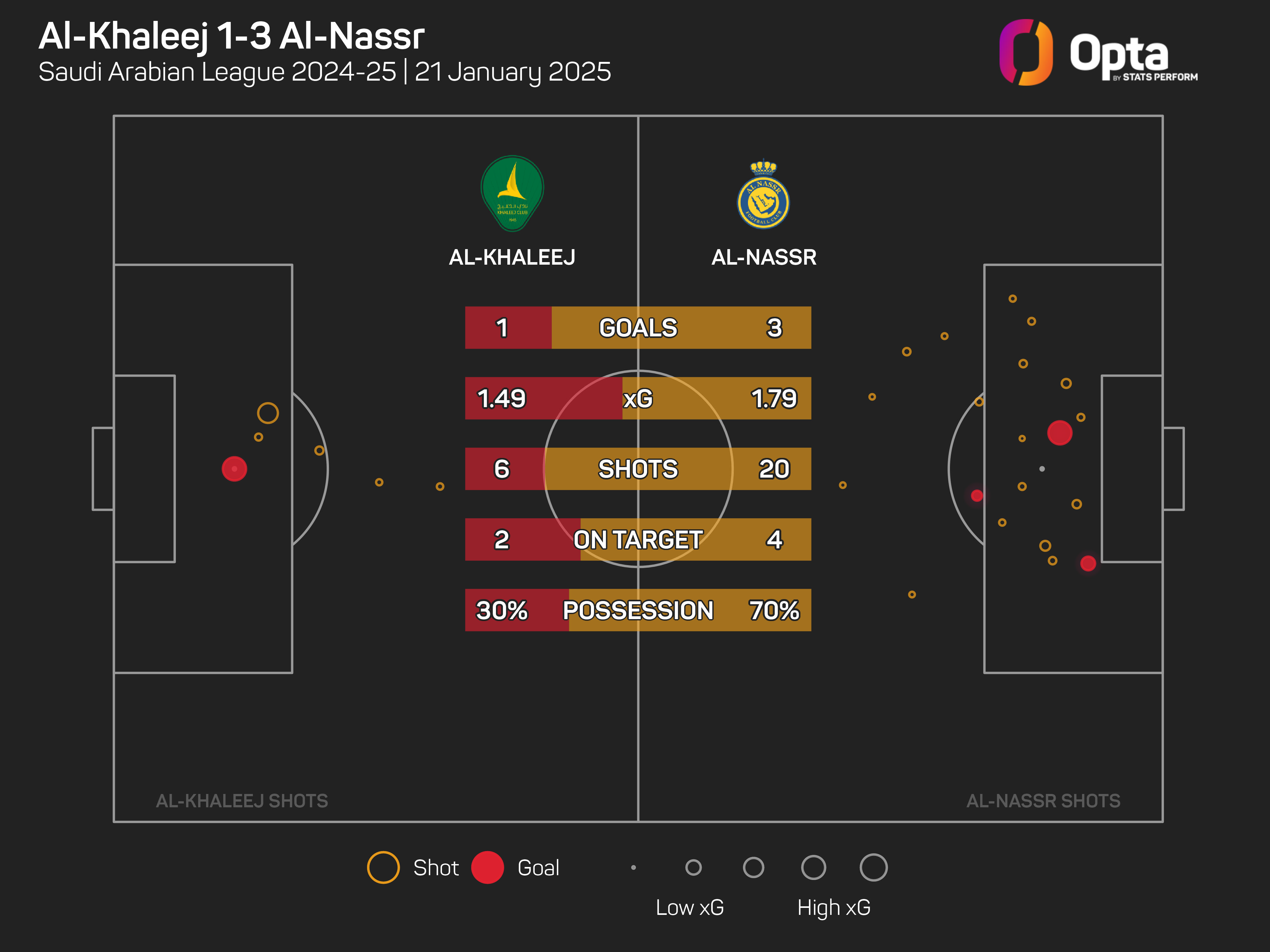 Namun, Al-Nassr bergelut untuk memecahkan kebuntuan perlawanan sebelum sepakan voli Ronaldo terhasil pada minit ke-65, namun Kostas Fortounis pantas menyamakan kedudukan menerusi sepakan penalti berikutan bola terkena tangan Ali Lajami pula.