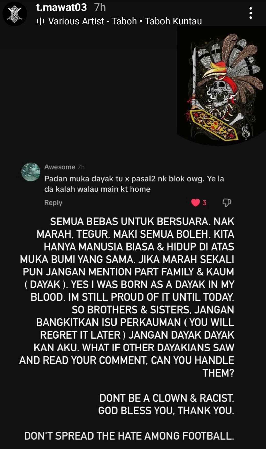 Perkara itu dikongsi sendiri oleh bekas pertahanan Sabah menerusi Instagramnya sambil menegur individu tersebut untuk menghentikan sentimen berbaur pergaduhan itu.