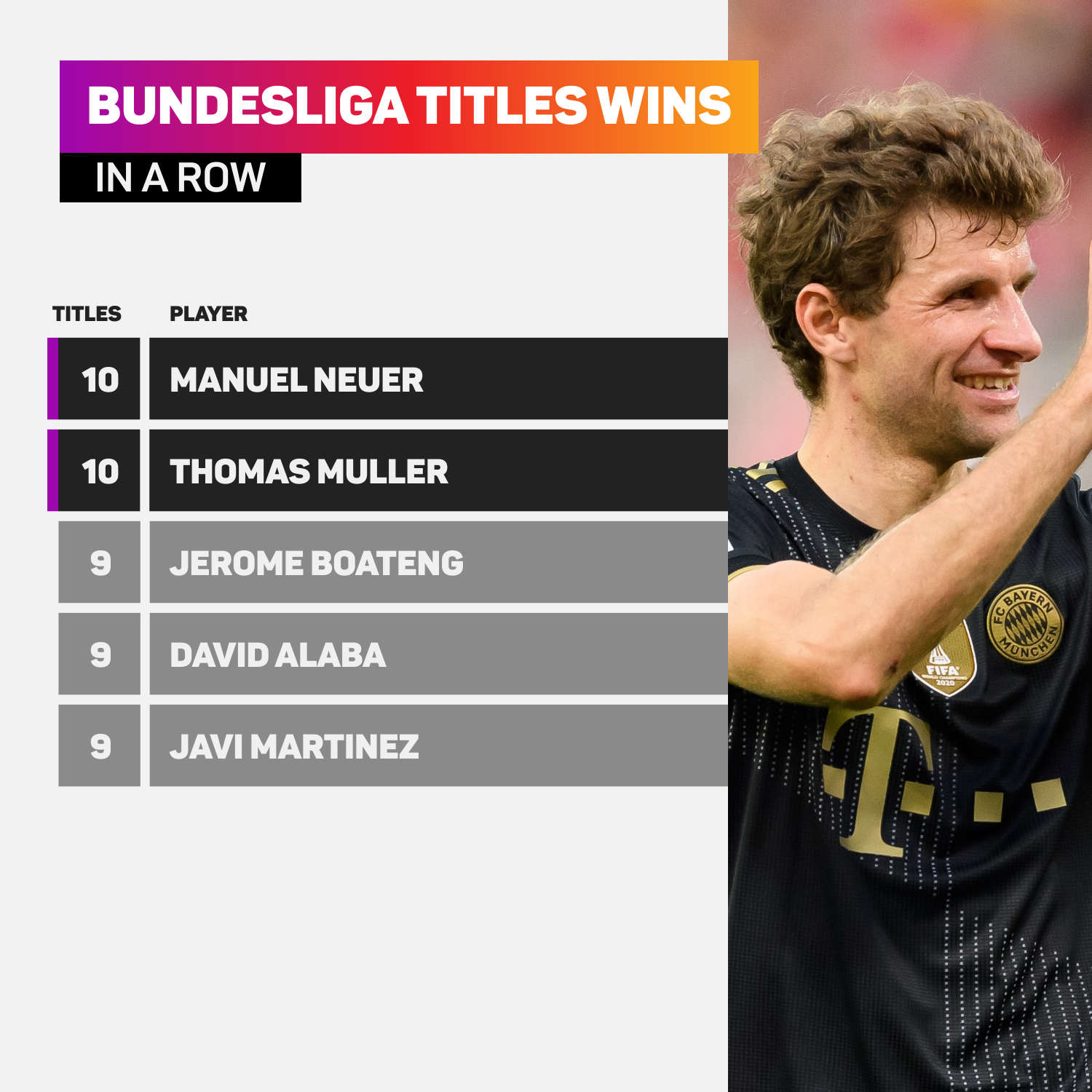 Muller secara keseluruhan telah memenangi 11 kejuaraan Bundesliga bersama Bayern dengan kejayaan terbarunya musim ini menyaksikan dia mengatasi David Alaba (10 gelaran Bundesliga) dalam senarai pemain paling berjaya dalam liga itu.