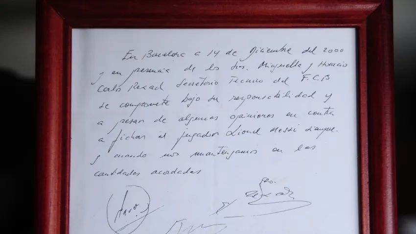Perjanjian yang pada dasarnya untuk menandatangani Messi yang ketika itu berusia 13 tahun telah ditulis di atas sehelai napkin hampir 25 tahun lalu di sebuah kelab tenis Barcelona.