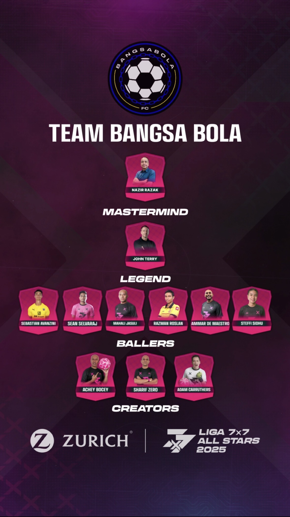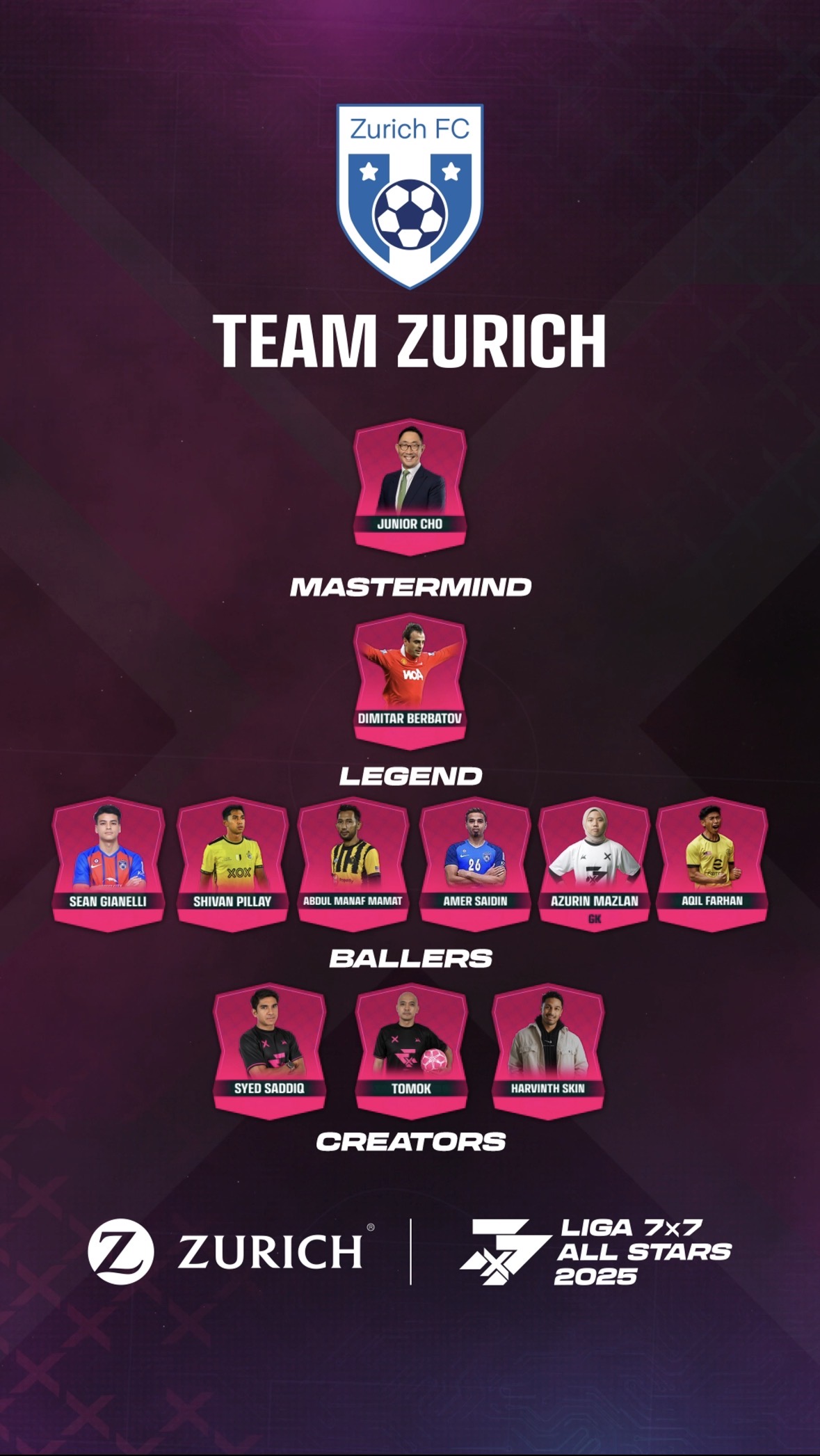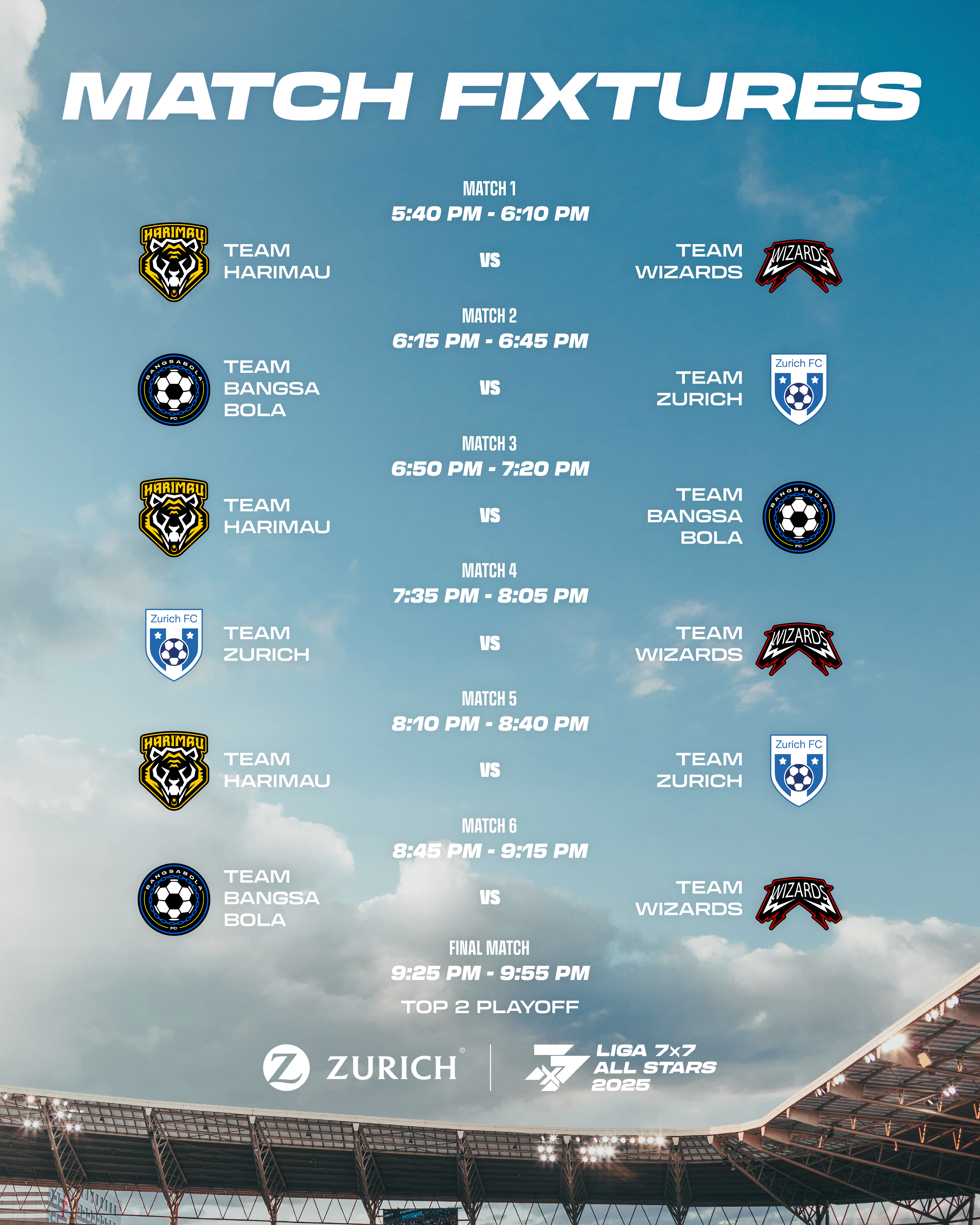 Dengan konsep tujuh sebelah, Zurich Liga 7X7 All Stars 2025 turut bakal menampilkan ikon tanah air seperti bekas Menteri Belia dan Sukan, Khairy Jamaluddin, selain Tony Fernandes dan bekas pemain kebangsaan, antaranya Indra Putra Mahyuddin, Safee Sali, Razman Roslan.