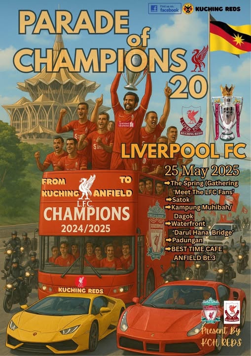 Kumpulan penyokong Liverpool yang bergelar Kuching Reds turut merasakan bahangnya dengan berarak dengan bas di sekitar bandar raya Kuching sambil menjulang replika trofi EPL sebelum memenuhi perkarangan The Spring, Sarawak, semalam.