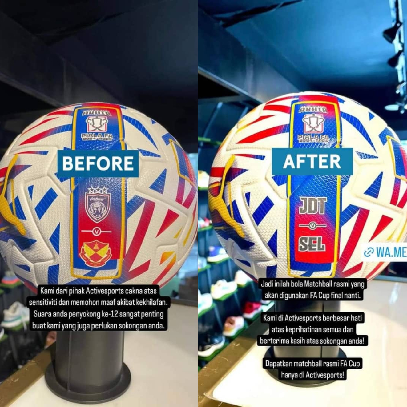 Lantas tindakan pantas diambil oleh Active Sports untuk menukar logo bola berkenaan kepada tulisan pasukan JDT & SEL, sekaligus mengelakkan perdebatan dan kontroversi ini berlanjutan di mana ianya akan merencatkan kehangatan perlawanan akhir yang akan berlangsung pada Sabtu ini.
