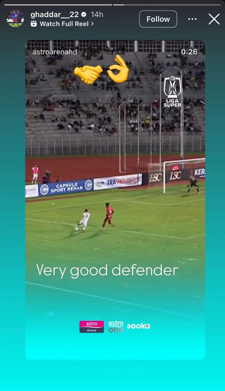 Bekas penyerang berbisa Kelantan, Mohamad Ghaddar, dilihat seakan menyindir kualiti yang dipamerkan barisan pertahanan Kelantan The Real Warriors selepas tewas 0-4 kepada Kuching City, dalam perlawanan mingu pertama Liga Super 2025/26, malam tadi.