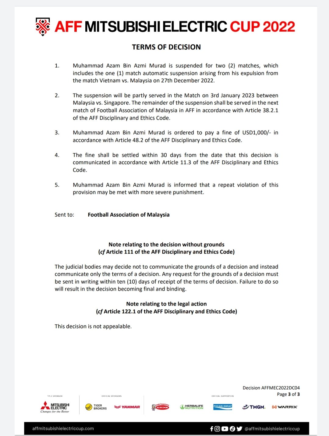 Mesyuarat Jawatankuasa Teknikal dan Etika Persekutuan Bola Sepak Asean (AFF) mendapati Azam Azmi bersalah dalam insiden kekasaran di Stadium My Dinh itu yang menyaksikannya dibuang padang pada minit ke-62.