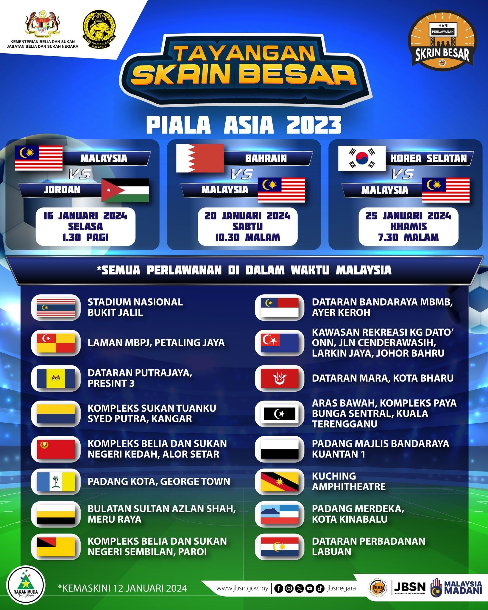 Selain itu, anda juga dialu-alukan untuk ke tayangan skrin besar bagi menghidupkan lagi ‘vibe’ stadium yang akan diadakan di 16 lokasi seluruh negara bagi semua perlawanan melibatkan pasukan Malaysia.