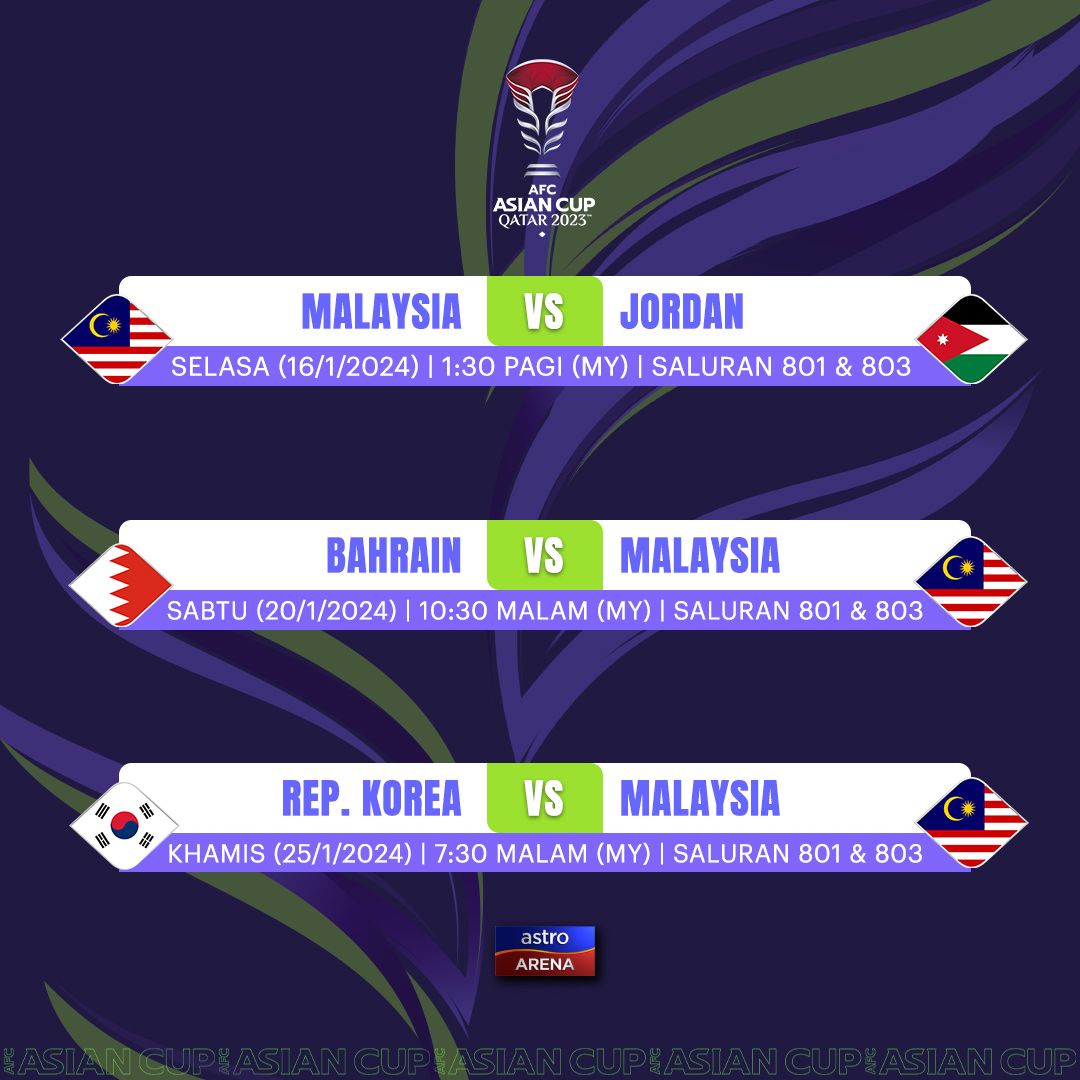 Ayuh berikan sokongan dan sorakkan anda kepada skuad Harimau Malaya di AFC Piala Asia, Qatar 2023 dan ikuti liputan langsung 51 perlawanan di Astro bermula pada 12 Januari hingga 10 Februari 2024.