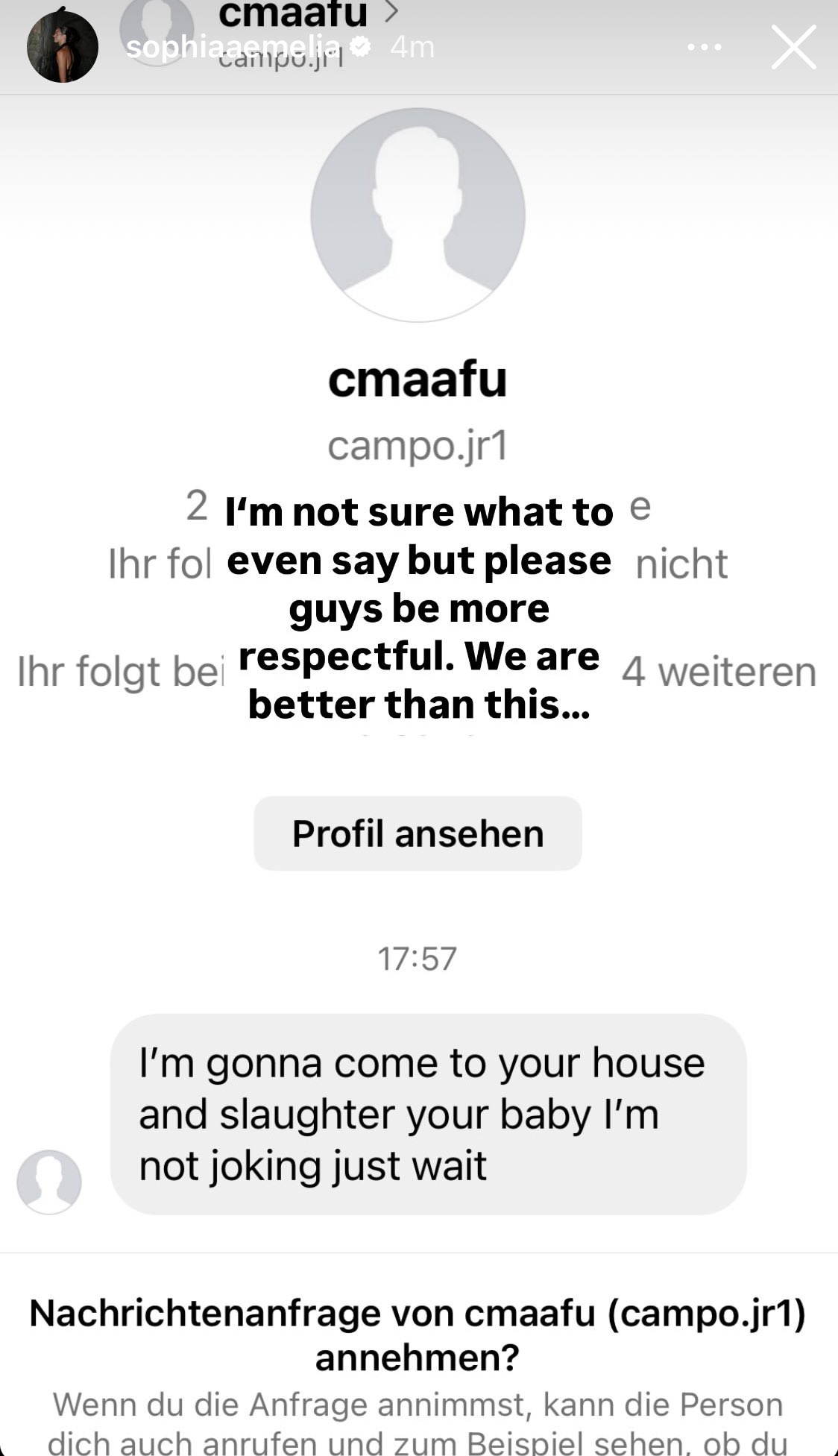 Lantas, Sophia memberi nasihatnya di Instragram dengan berbunyi: "Saya tidak tahu apa nak dikatakan tetapi tolonglah hormat. (Peradaban) kita lebih baik daripada ini."