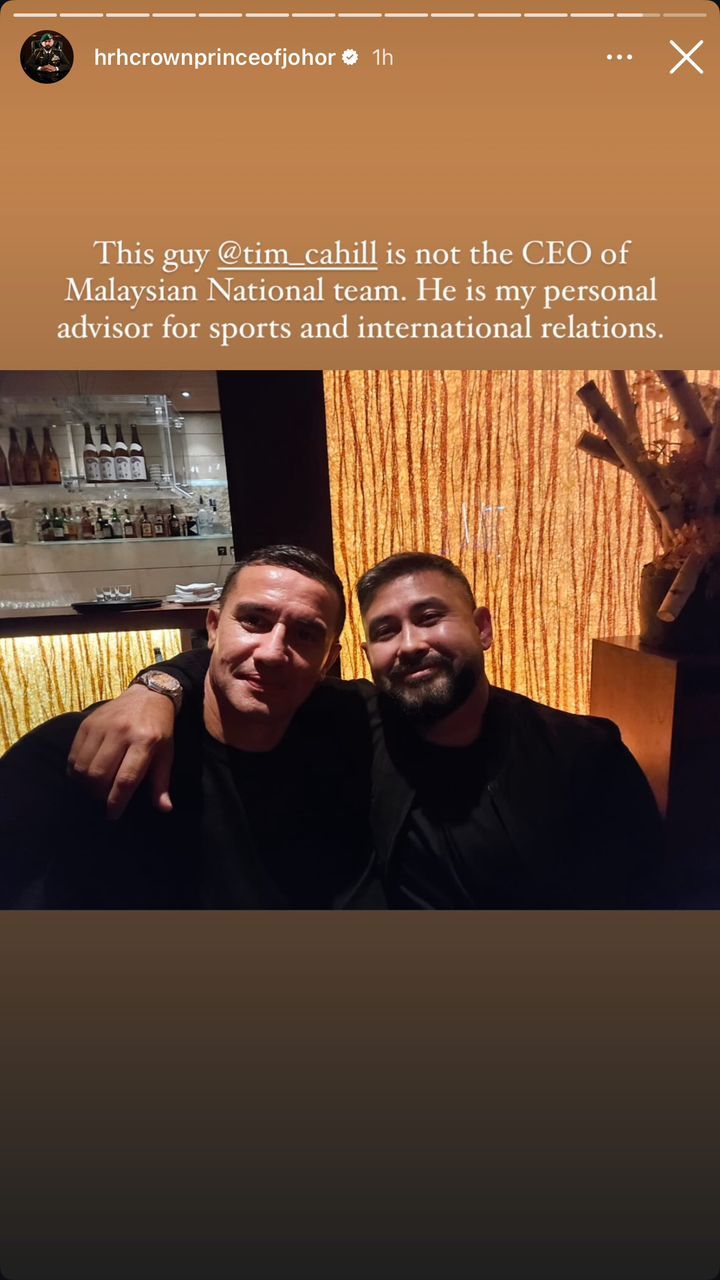 Tunku Mahkota Johor (TMJ), Tunku Ismail Sultan Ibrahim, menidakkan khabar angin yang mengatakan bekas pemain Australia, Tim Cahill, sebagai ketua pegawai eksekutif (CEO) dalam penstrukturan terbaru skuad Harimau Malaya di bawah projek Persatuan Bolasepak Malaysia (FAM).