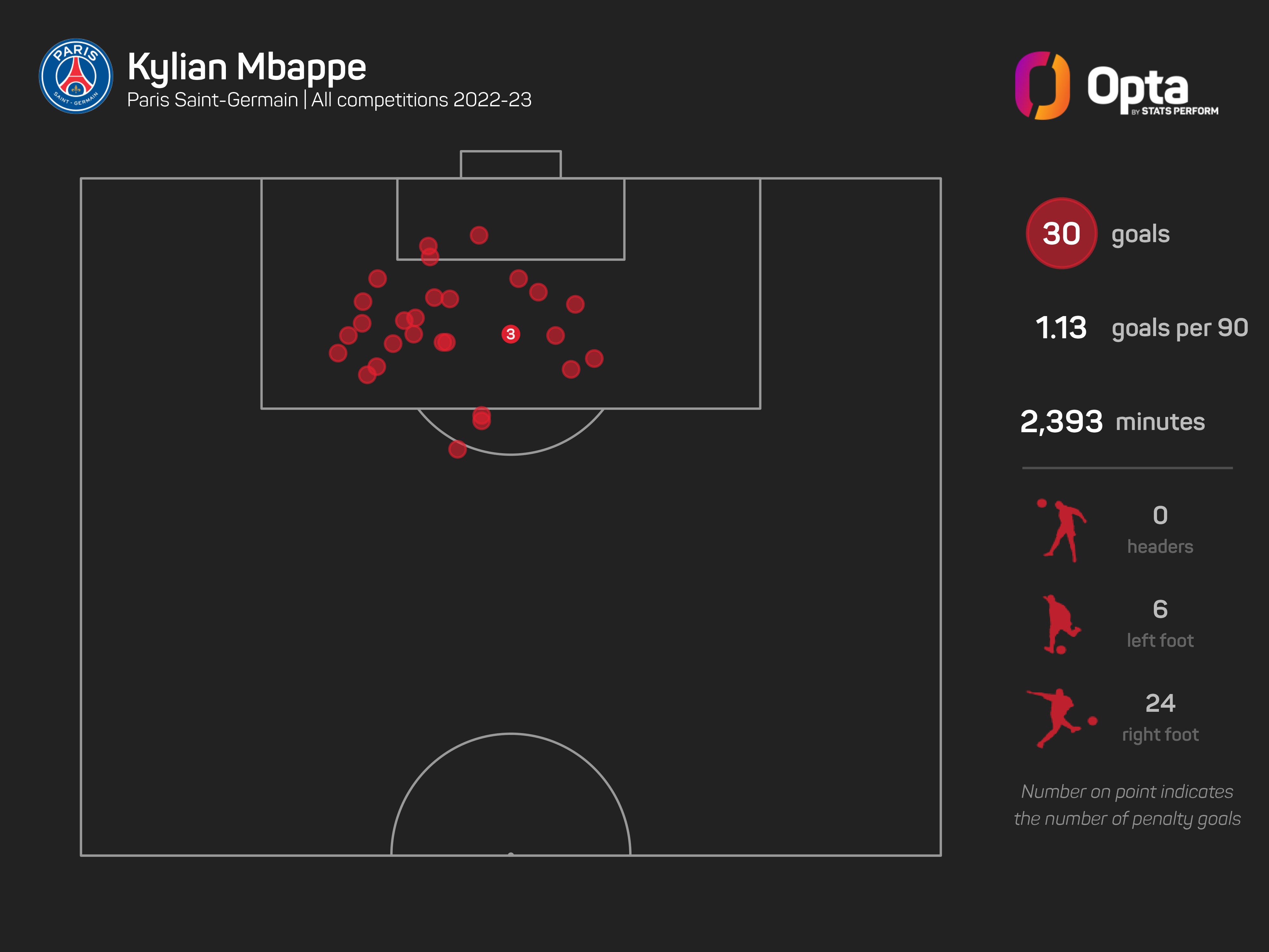 Pemain berusia 31 tahun itu terlibat dengan 34 jaringan musim ini, di mana hanya di belakang rakan sepasukan, Kylian Mbappe (37) dan Erling Haaland (38) di sepanjang lima liga utama Eropah.