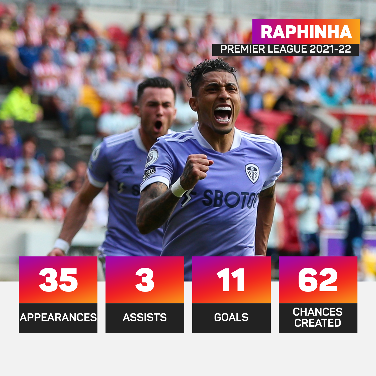 Sepanjang 19 bulan dalam liga utama England, hanya Son Heung-min daripada Tottenham (131) telah mencipta lebih banyak peluang berbanding Raphinha yang menyerlahkan kreativitinya sebanyak 129 kali.