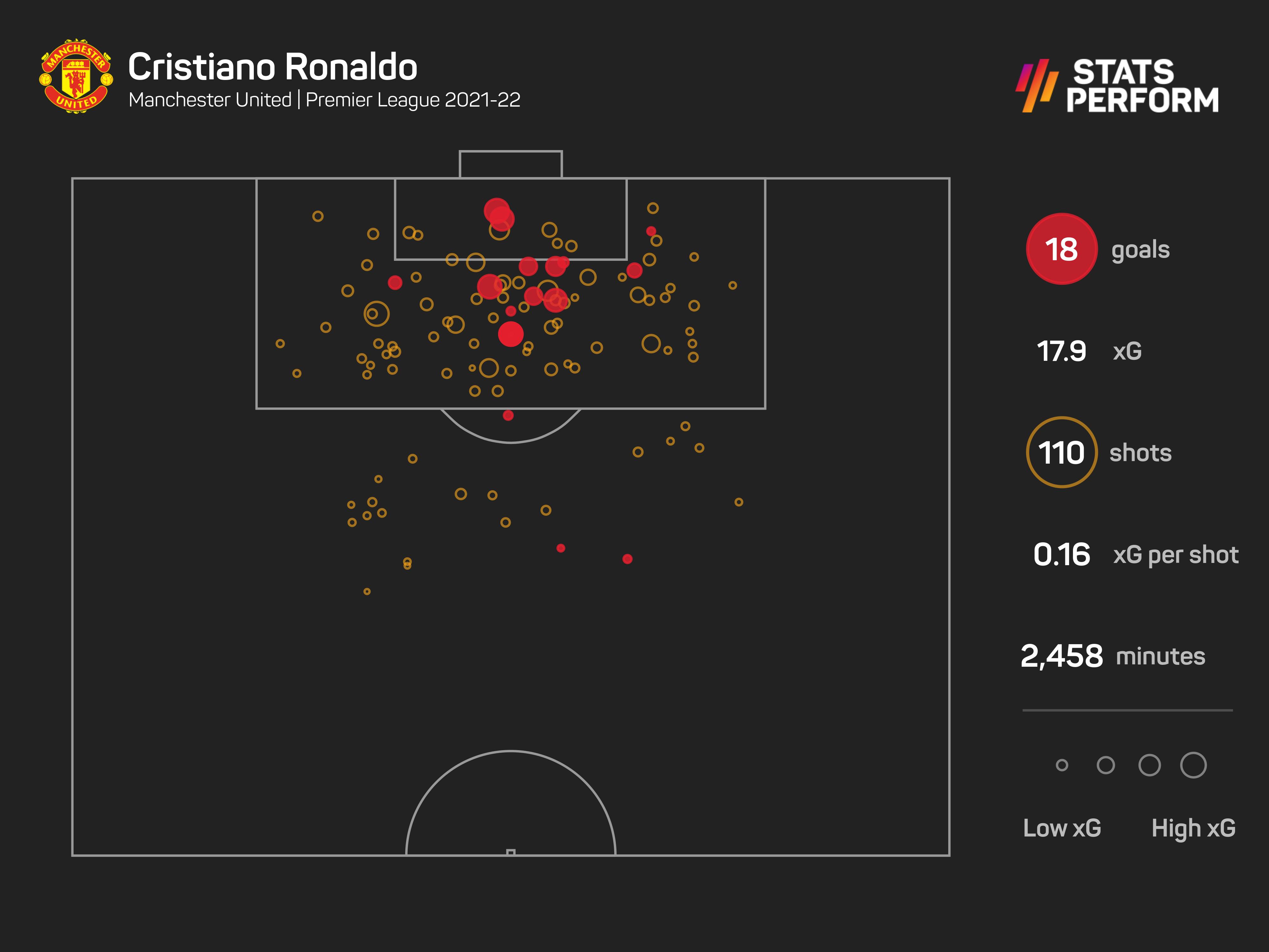 Dia kemudian menghasilkan 18 gol dalam Liga Perdana Inggeris (EPL) musim ini, di mana hanya Mohamed Salah dan Son Heung-min -- kedua-duanya beraksi lebih lima perlawanan berbanding Ronaldo -- memiliki rekod lebih baik.