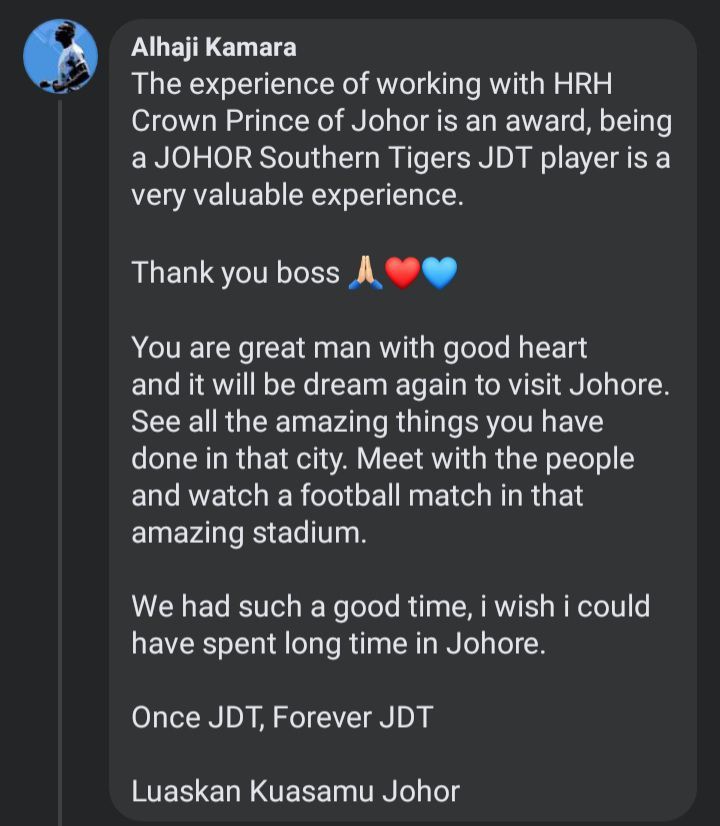 "Pengalaman bekerja bersama Tunku Mahkota Johor adalah satu anugerah, menjadi pemain JDT merupakan sebuah pengalaman yang sangat berharga.