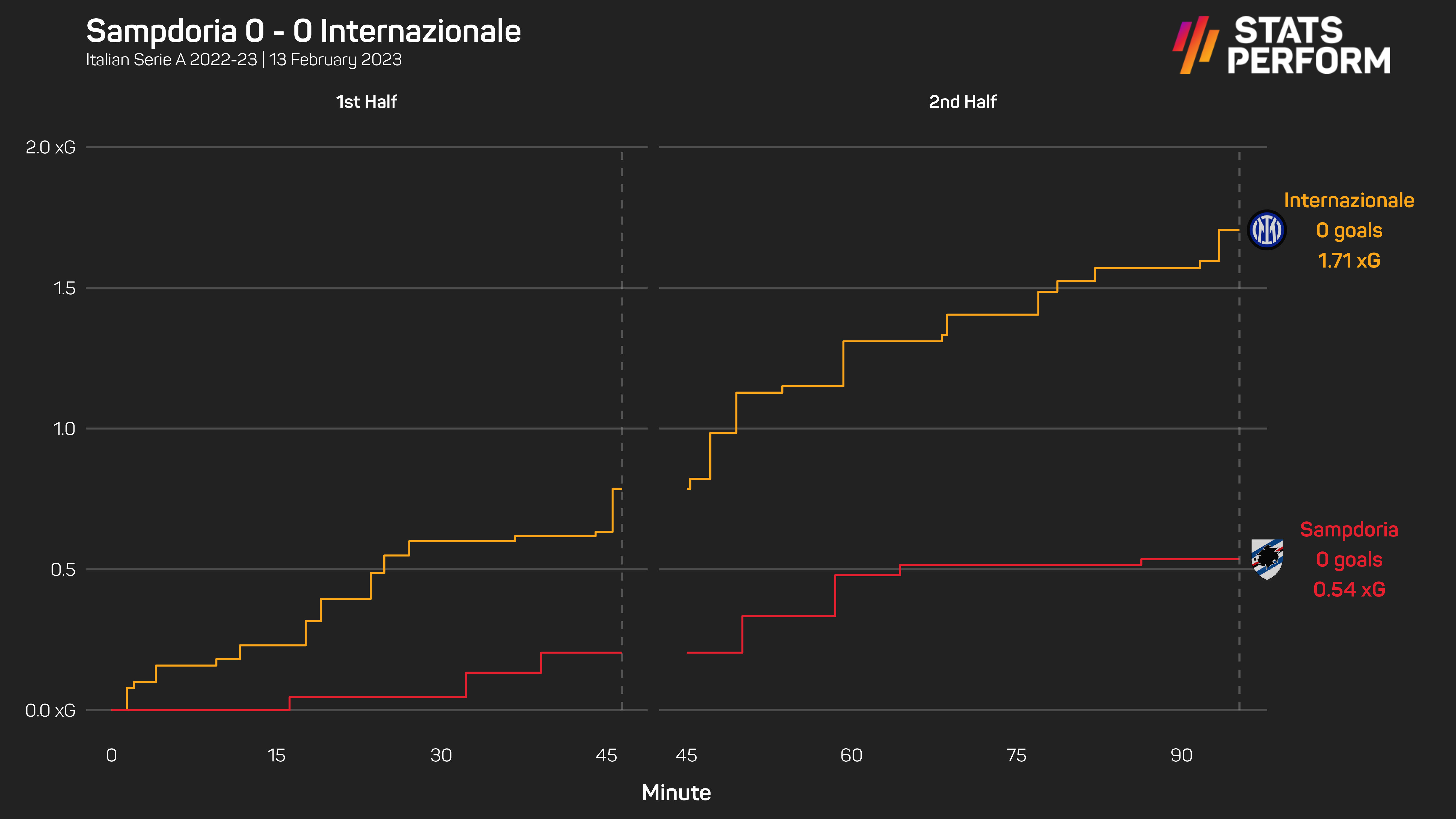 Nerazzurri melancarkan 25 percubaan dalam perlawanan berat sebelah itu untuk pertama kalinya Inter merekodkan percubaan tanpa menghasilkan sebarang gol dalam perlawanan Serie A sejak Februari 2022 (29 percubaan dirakamkan ketika menghadapi Sassuolo di tempat sendiri).