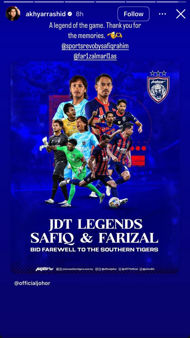 Pemain sayap kebangsaan, Akhyar Rashid, mengucapkan terima kasih kepada dua pemain legenda Johor Darul Ta'zim (JDT) iaitu Safiq Rahim dan Farizal Marlias.