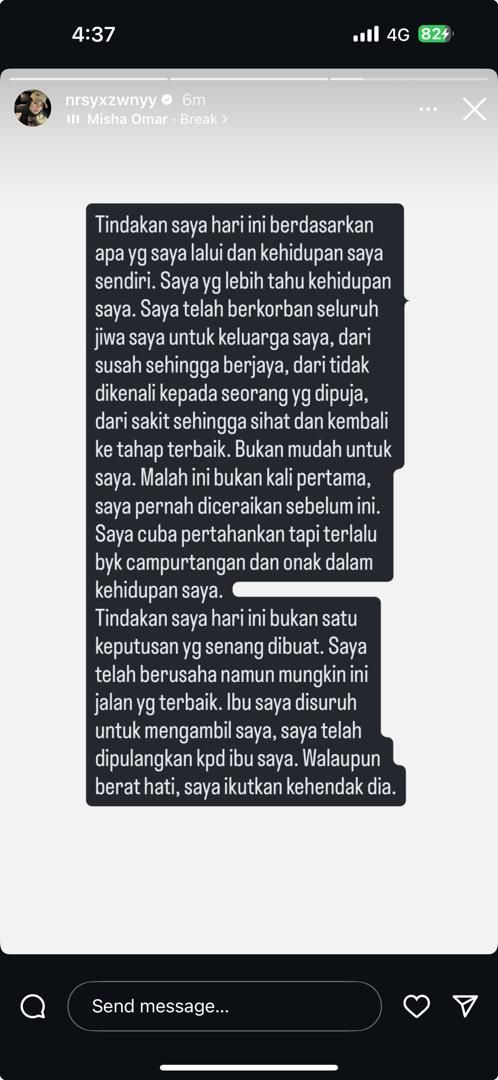 Menerusi satu kiriman Instagram Story, Nur Syazwani Mizuana, meluahkan apa yang terbuku di hatinya berkenaan status rumah tangganya ketika ini.
