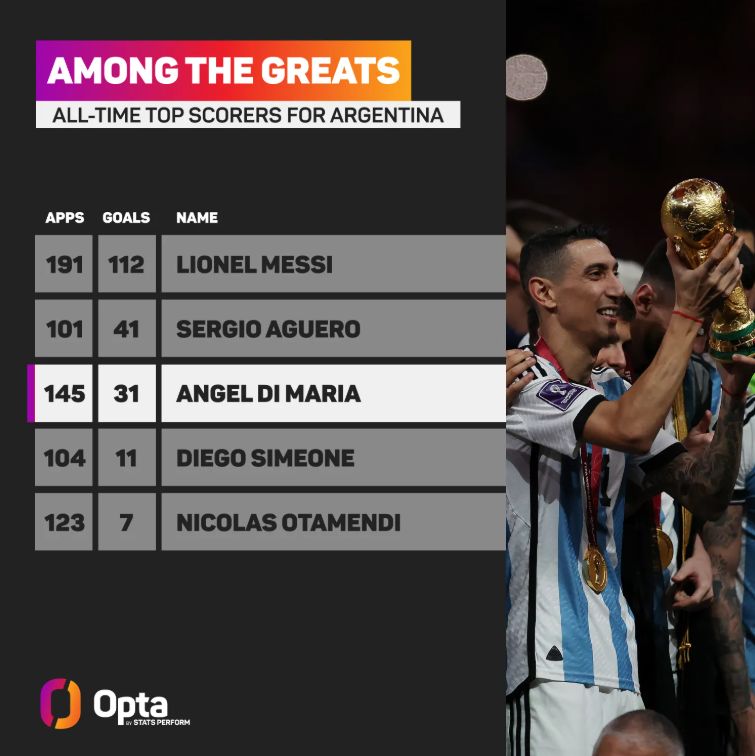 Untuk rekod, hanya Javier Mascherano (147) dan Lionel Messi (191) yang telah membuat lebih banyak penampilan untuk Argentina berbanding Di Maria (141) sebelum dia bersara daripada bola sepak antarabangsa pada 2023.