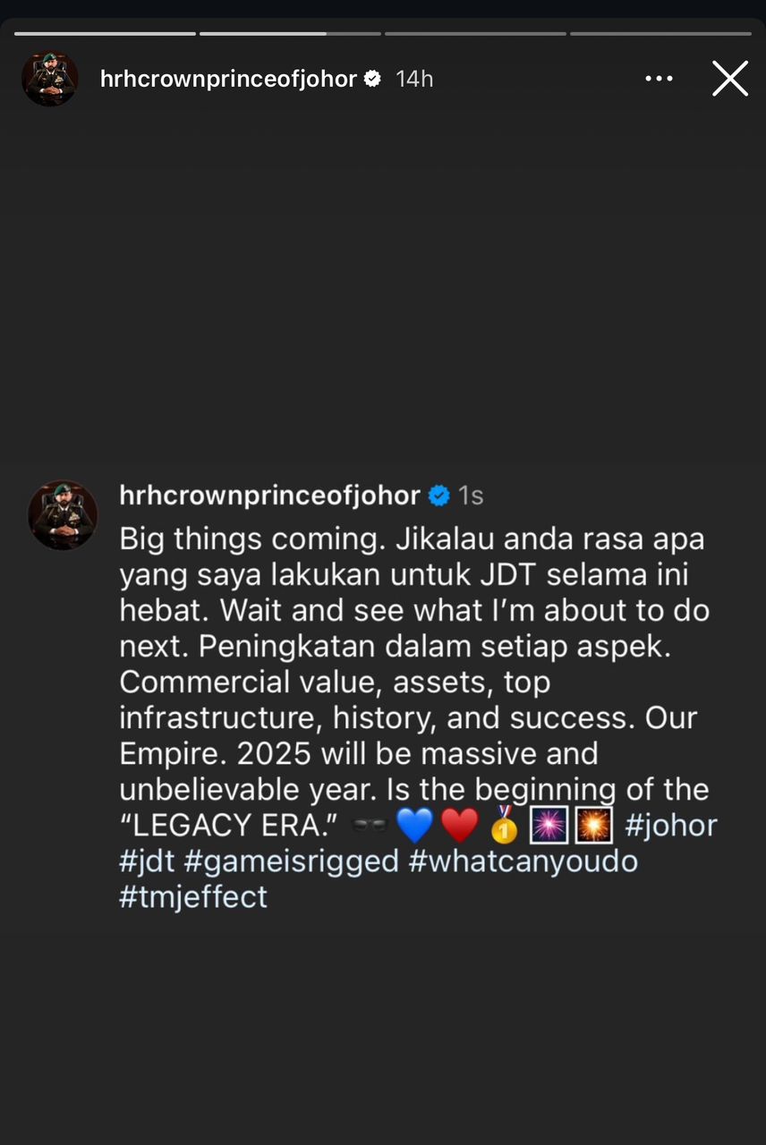 Tunku Mahkota Johor (TMJ), Tunku Ismail Sultan Ibrahim, memberi bayangan tahun 2025 bakal menjadi detik yang paling hebat di antara semua pencapaiannya bersama juara Liga Super Super 10 kali berturut-turut, Johor Darul Ta'zim (JDT).