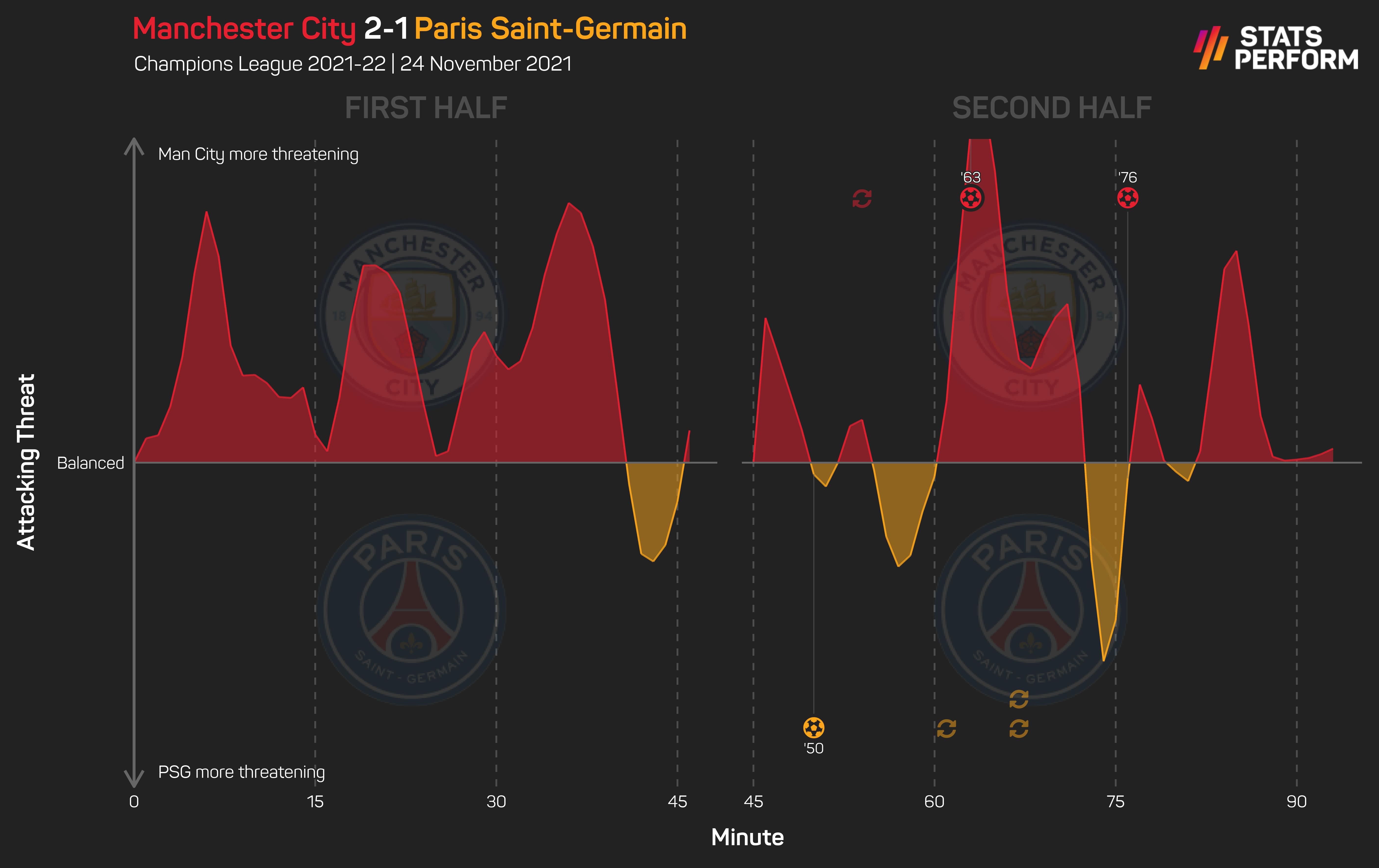 Malah, anak buah Pep Guardiola melakukan 37 sentuhan di dalam kotak penalti lawan sementara wakil Ligue 1 itu hanya mampu melengkapkan 10 kali -- secara tidak langsung menghadkan impak Lionel Messi, Neymar dan Kylian Mbappe.