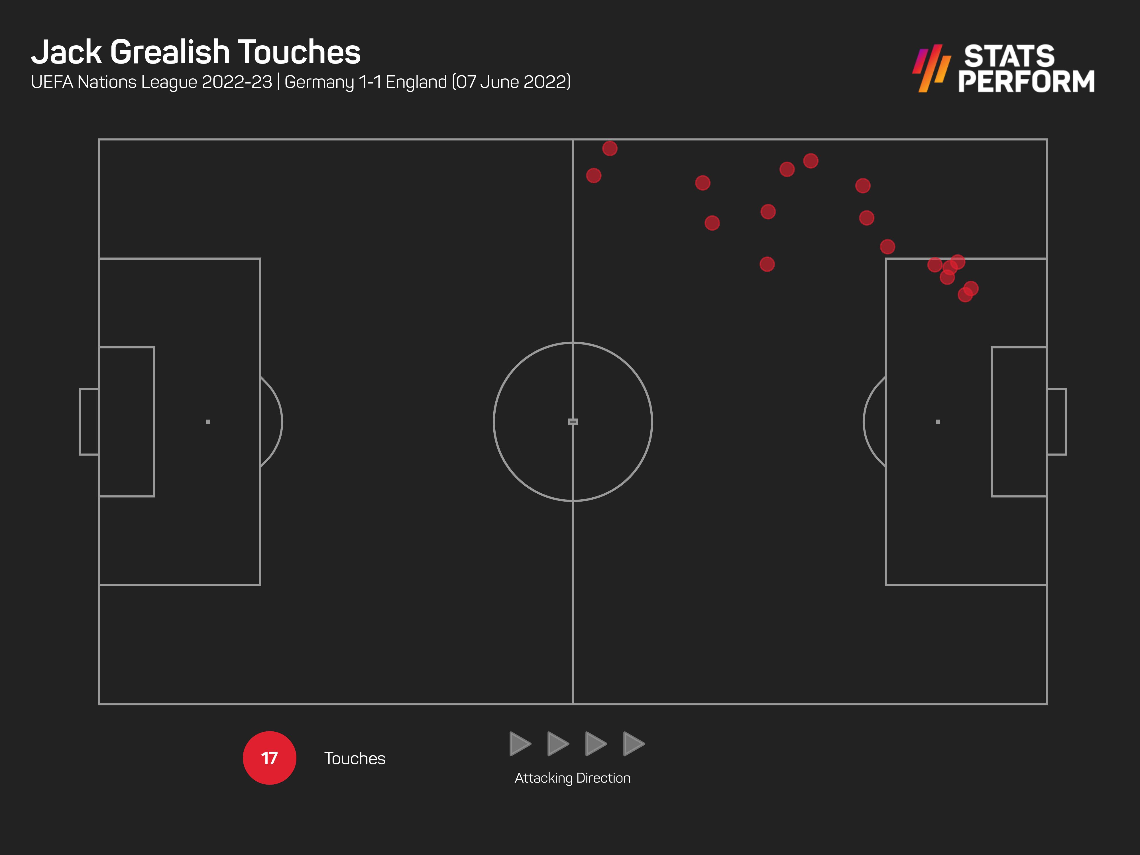 Walaupun minit permainannya terhad, Grealish berjaya melakukan enam sentuhan di kotak penalti lawan termasuk satu peluang terbuka -- dua kali ganda daripada mana-mana pemain England selain Kane (tujuh).