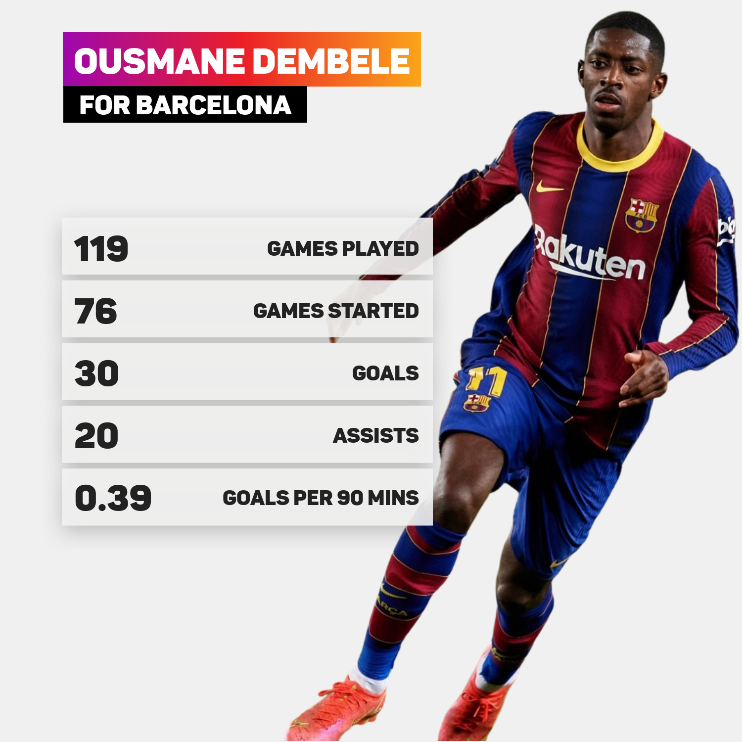Secara keseluruhan, dia telah melakukan 119 penampilan buat Barca dan 76 daripadanya adalah sebagai kesebelasan utama.