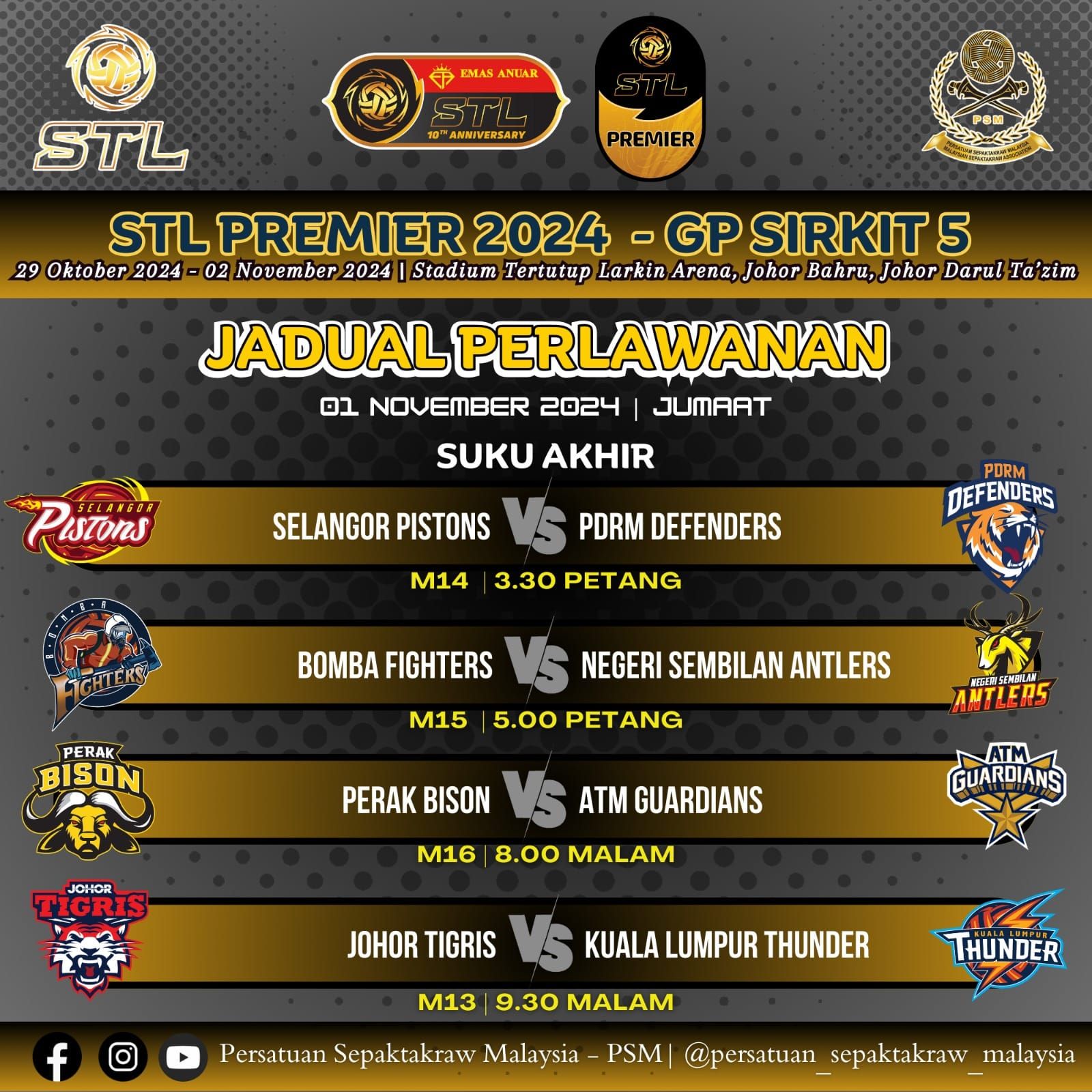 Saingan suku akhir Grand Prix Johor, Emas Anuar Liga Sepaktakraw Malaysia (STL) 2024 diteruskan di di Stadium Arena Larkin, Johor Bahru, esok.