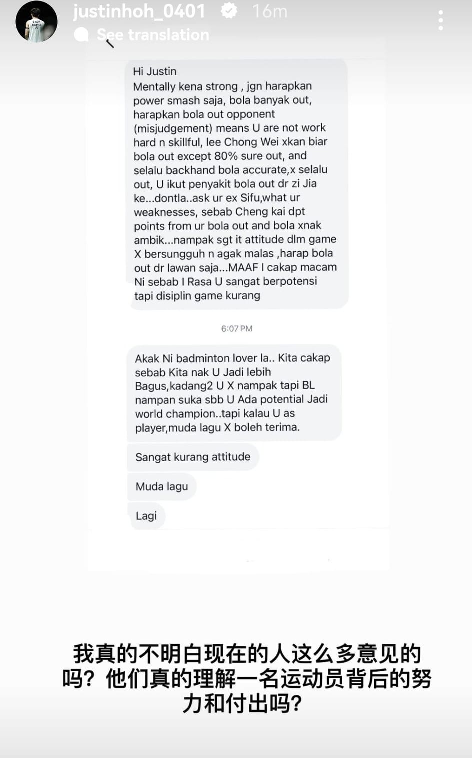 Situasi ini dapat dilihat apabila pemain perseorangan lelaki remaja negara, Justin Hoh ada memuat naik instagram story tentang salah seorang "badminton lover" yang memberi kritikan terhadap perlawanan yang ditampilkan olehnya di kejohanan yang baru selesai baru-baru ini.