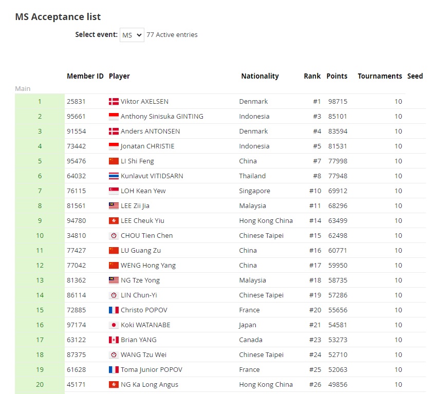Lee Zii Jia bakal menjadi pemain pilihan kelapan kejohanan Badminton Masters Malaysia dalam kategori perseorangan lelaki berdasarkan senarai penerimaan.