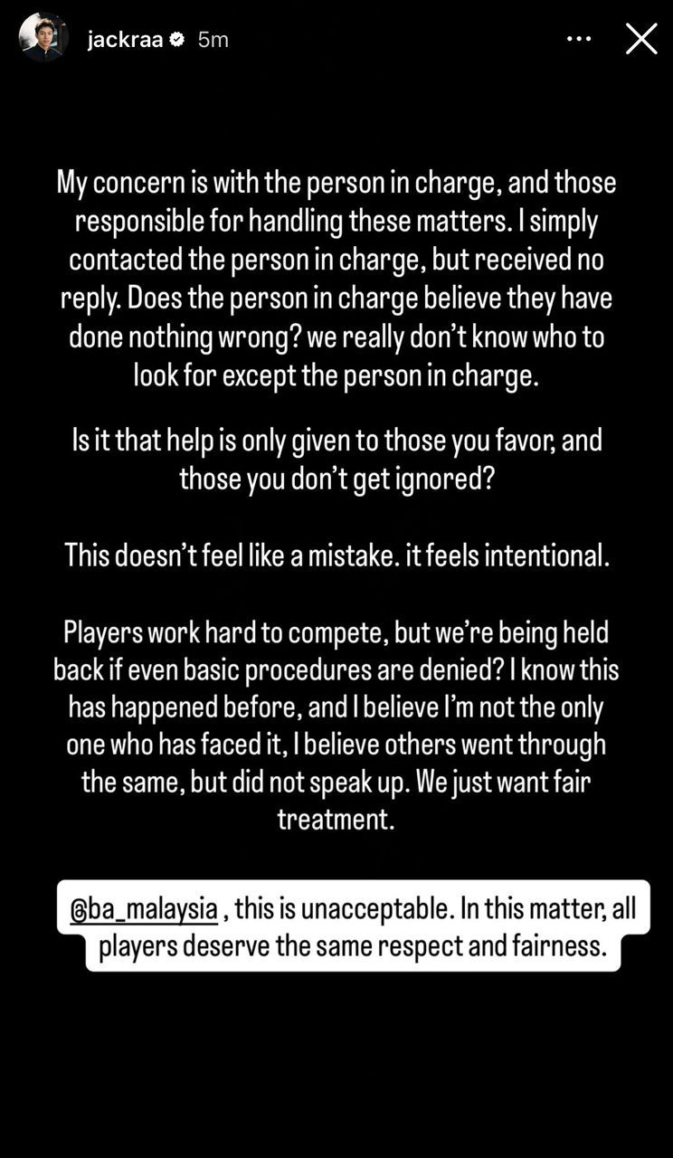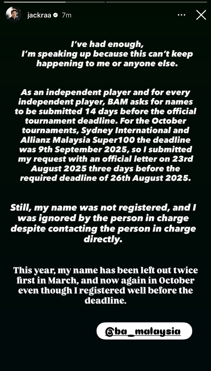 Dalam satu hantaran IG Story, pemain berusia 23 tahun itu, yang pernah membantu skuad negara memenangi Kejohanan Badminton Berpasukan Asia (BATC) pada 2022, berkata: "Saya sudah tidak tahan, saya bersuara kerana ini tidak boleh terus berlaku kepada saya atau orang lain.