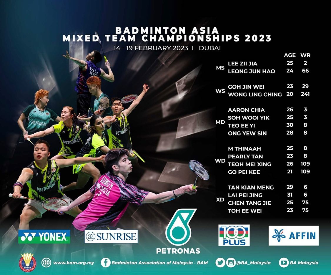 Bagi kategori perseorangan, Malaysia menyenaraikan lelaki di ranking keempat dunia, Lee Zii Jia, serta Leong Jun Hao untuk kejohanan itu yang bakal berlangsung pada 14 hingga 19 Februari depan.