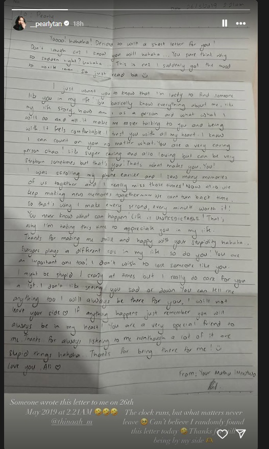 Pearly Tan berkongsi 'satu surat cinta' yang dia dapat daripada gandingan beregu wanitanya, M.Thinaah, pada awal Mei 2019, yang secara tidak langsung membuktikan ikatan pasangan itu yang tidak dapat dipecahkan sehingga hari ini.