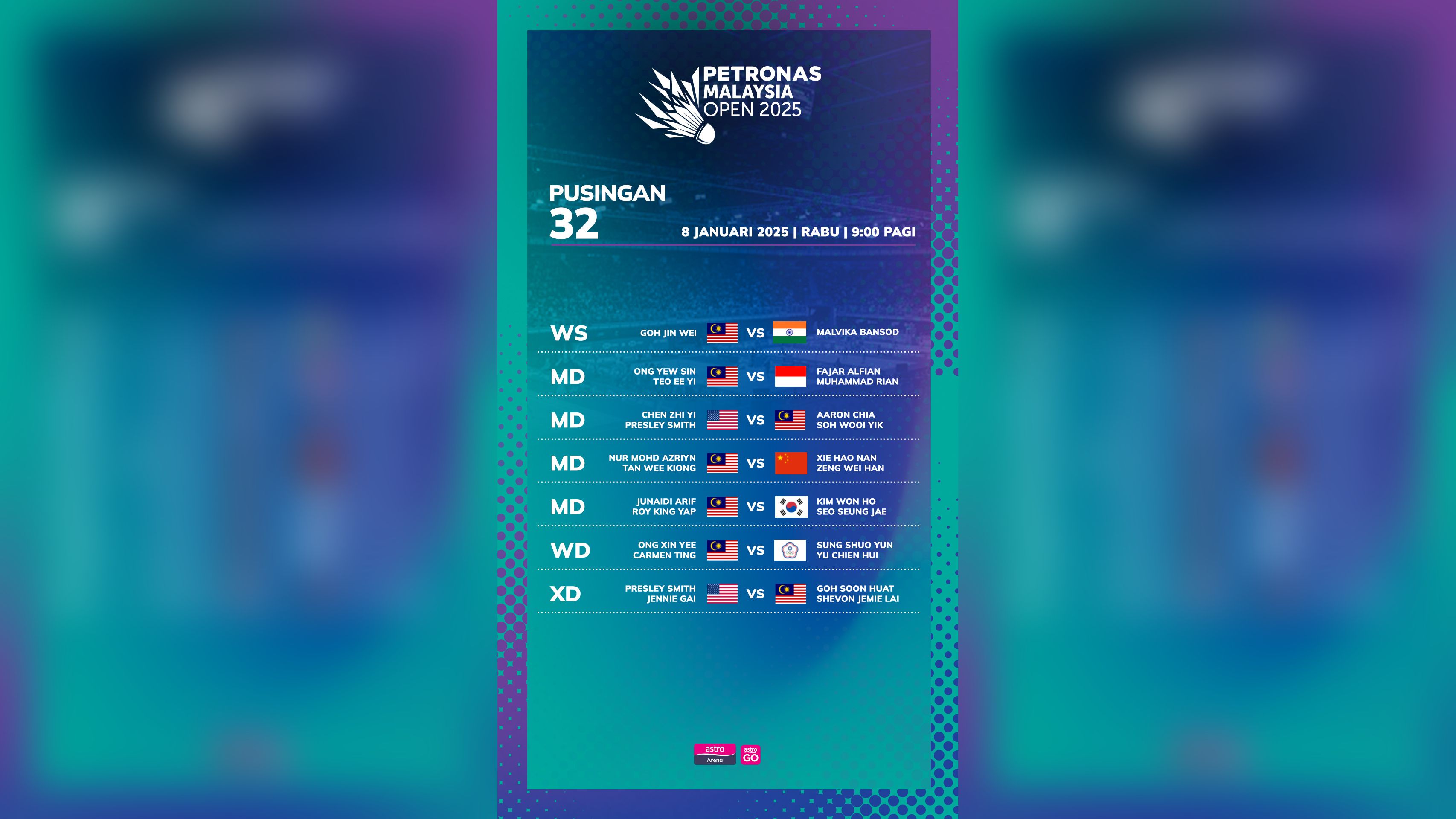 Saksikan perjuangan wakil negara di kejohanan berstatus Super 1000 itu secara langsung di Astro Arena saluran 801HD, Astro Badminton (815) dan live streaming di Astro Go bermula jam 8.30 pagi.
